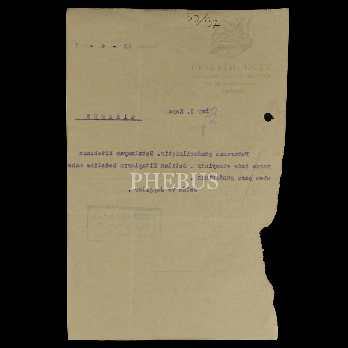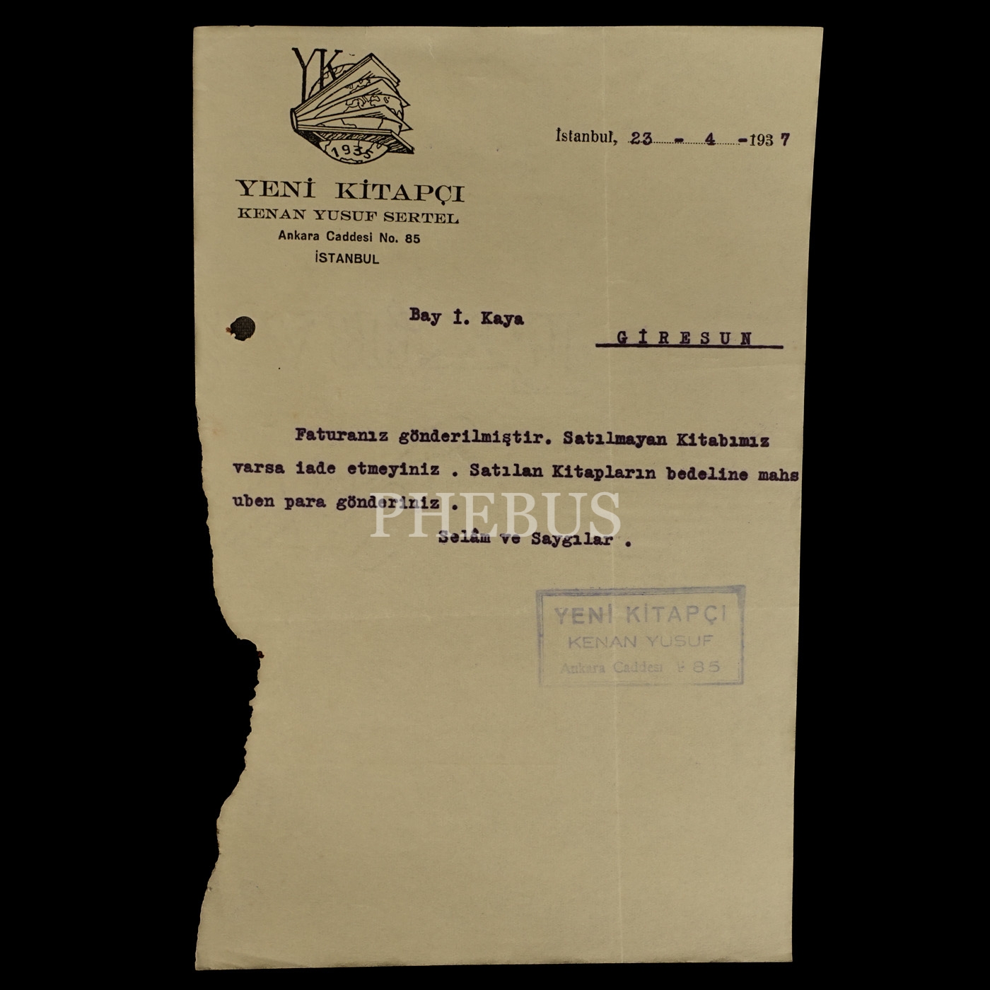 "Yeni Kitapçı (Kenan Yusuf Sertel)" antetli kâğıtla, İhsan Kaya Kütüphanesi (Giresun) sahibi İhsan Kaya´ya gönderilmiş fatura ve satışa dair daktilo bilgilendirme mektubu, 23 Nisan 1937, 15x23 cm...