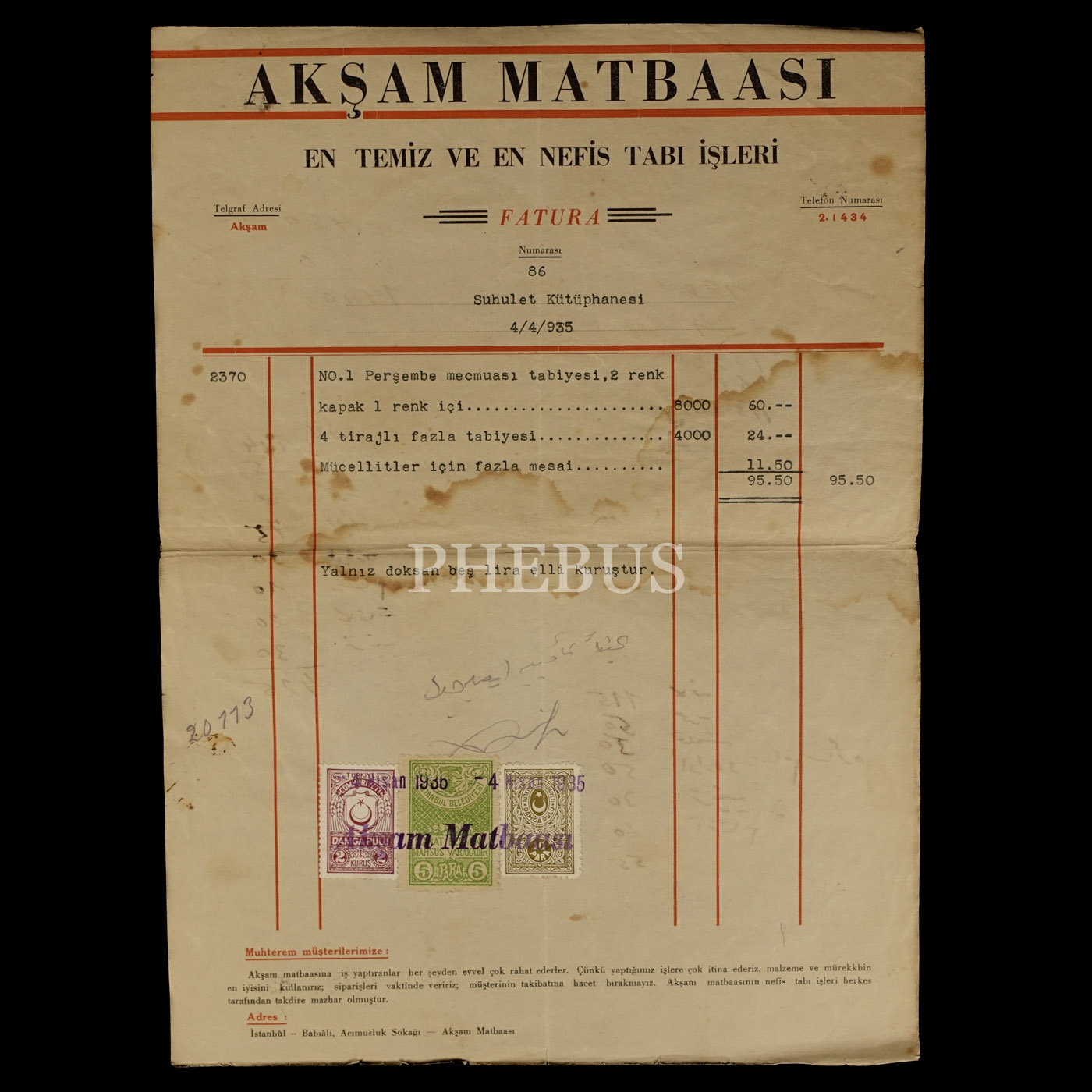 "Akşam Matbaası (En Temiz ve En Nefis Tabı İşleri)" antetli, Sühulet Kütüphanesi adına kesilmiş 4 Nisan 1935 tarihli fatura, 21x29 cm...