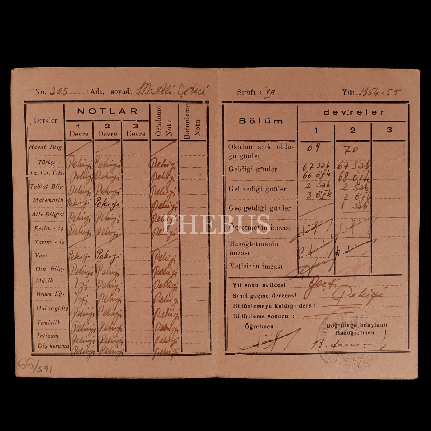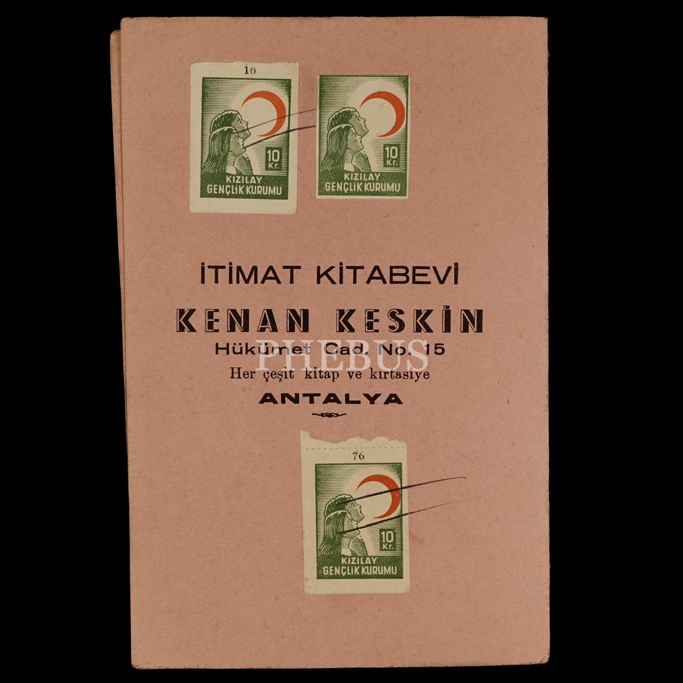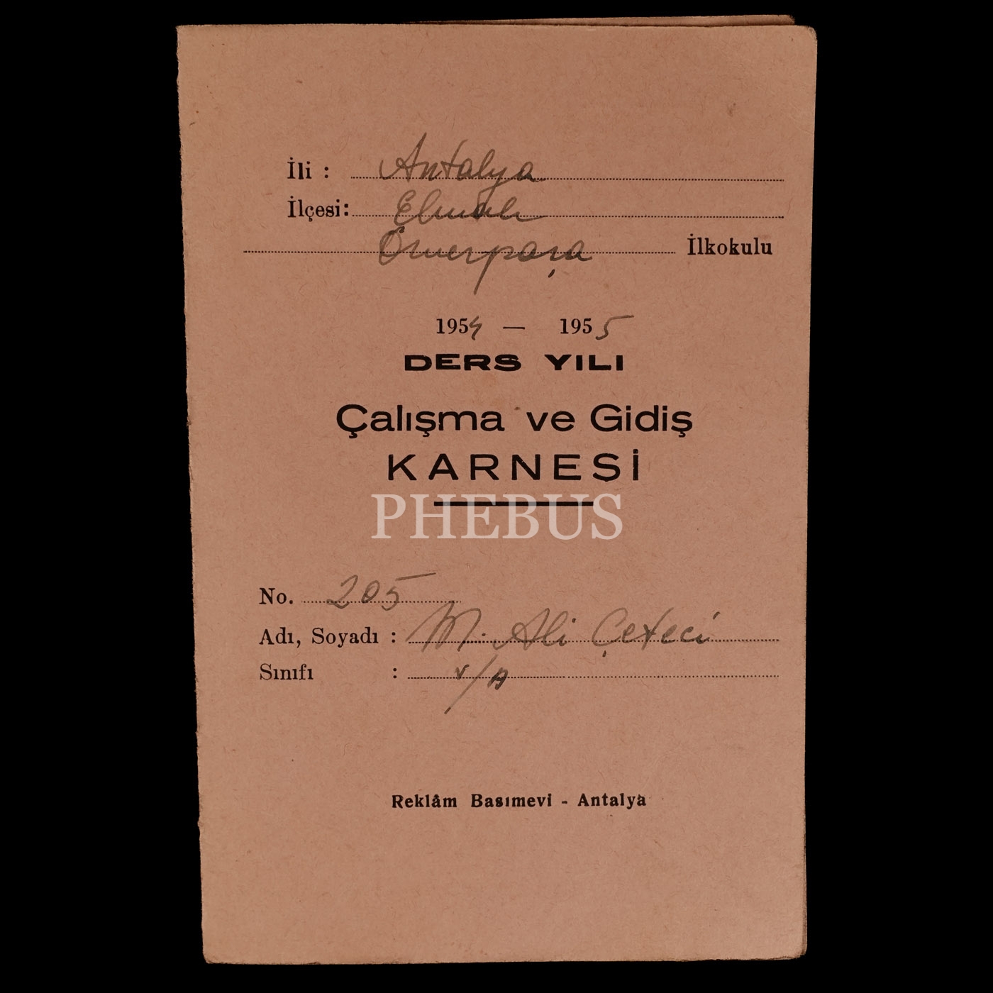 Arka yüzü "İtimat Kitabevi (Kenan Keskin) - Antalya" reklamlı, 1954-1955 Ders Yılı Çalışma ve Gidiş Karnesi (Elmalı Ömer Paşa İlkokulu, Antalya), 10x16 cm...