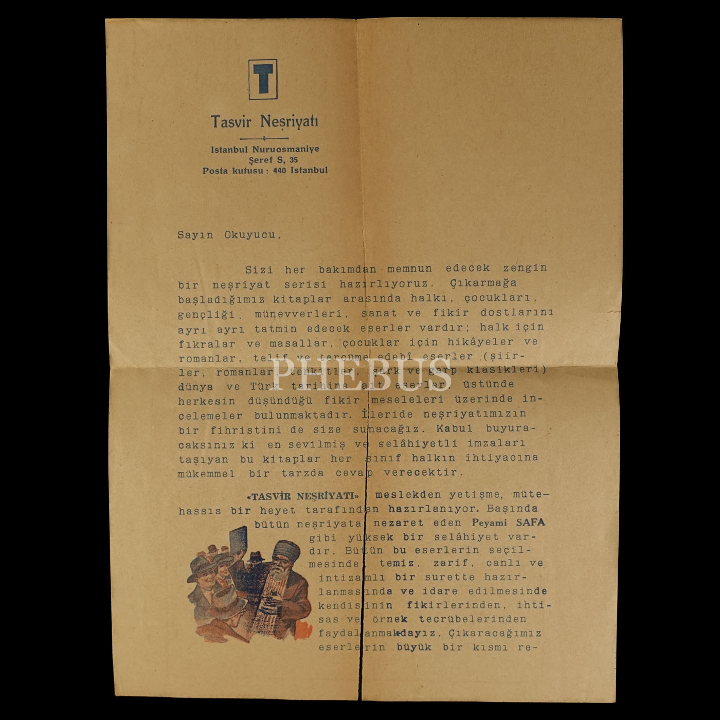 "Tasvir Neşriyatı meslekden yetişme, mütehassıs bir heyet tarafından hazırlanıyor. Başında bütün neşriyata nezaret eden Peyami Safa gibi yüksek bir selâhiyet vardır. Bütün bu eserlerin seçilmesinde, temiz, zarif, canlı ve intizamlı bir surette hazırlanmasında ve idare edilmesinde kendisinin fikirlerinden, ihtisas ve örnek tecrübelerinden faydalanmakdayız." *Alt orta bölümündeki kat izinin yarısına ulaşan bir açılma mevcuttur.
