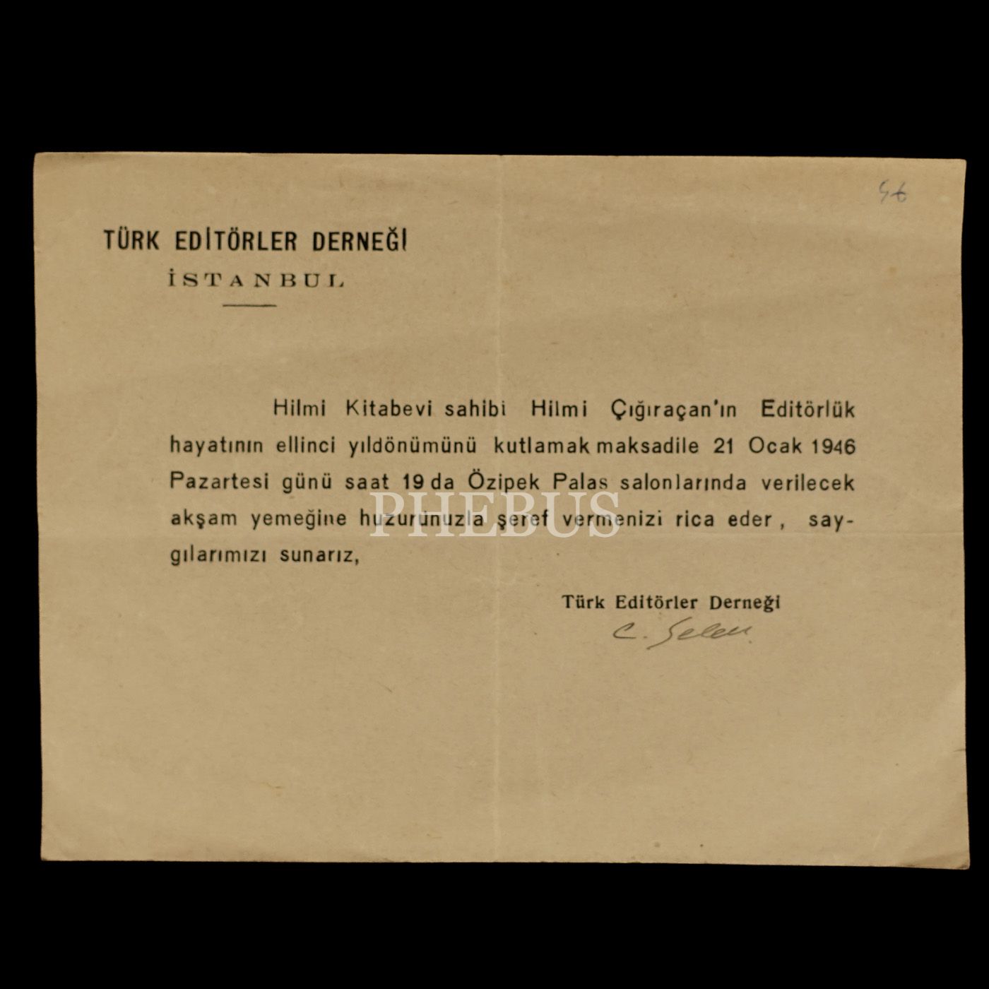 Hilmi Kitabevi sahibi Hilmi Çığıraçan´ın editörlük hayatının 50. yıldönümünü kutlamak amacıyla Türk Editörler Derneği´nin 21 Ocak 1946 tarihinde Özipek Palas´ta düzenlediği akşam yemeğinin davetiyesi, 15x12 cm...