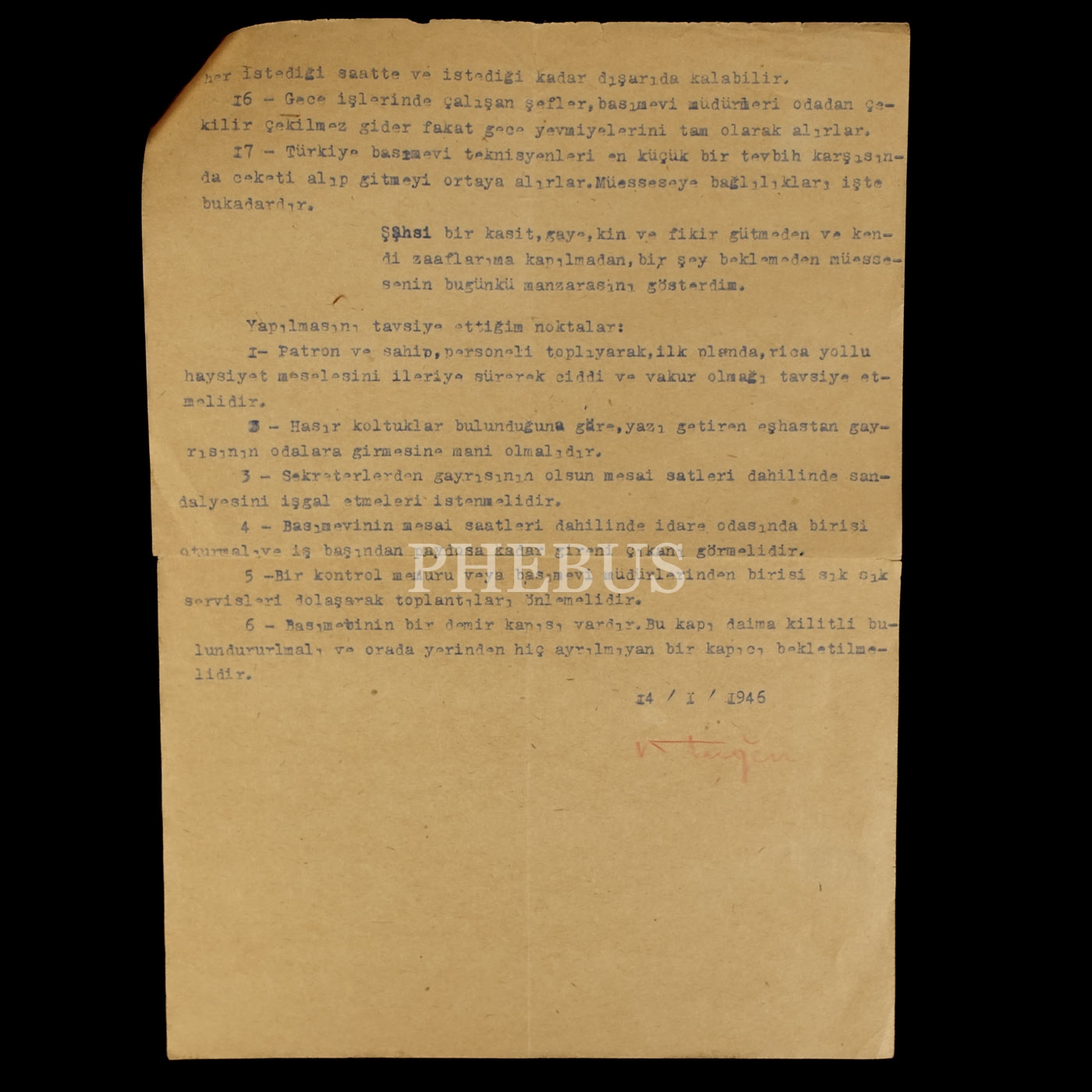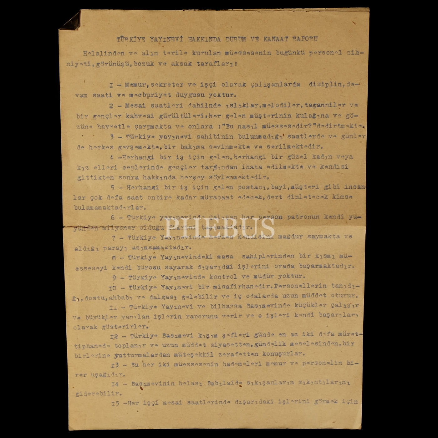 Bir denetmenin, 14 Ocak 1946 tarihinde hazırladığı, "Türkiye Yayınevi Hakkında Durum ve Raporu" başlıklı, 17+6 maddelik, ıslak imzalı daktilo raporu, 2 sayfa, 19x27 cm...