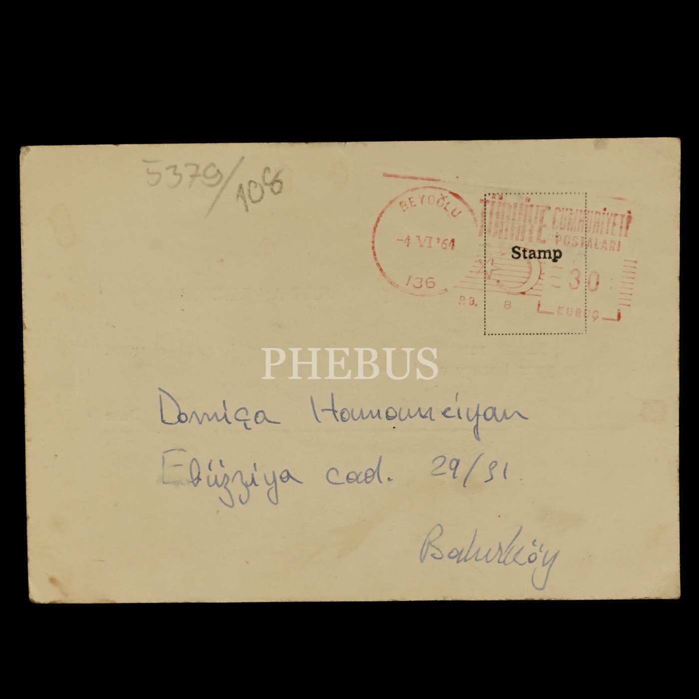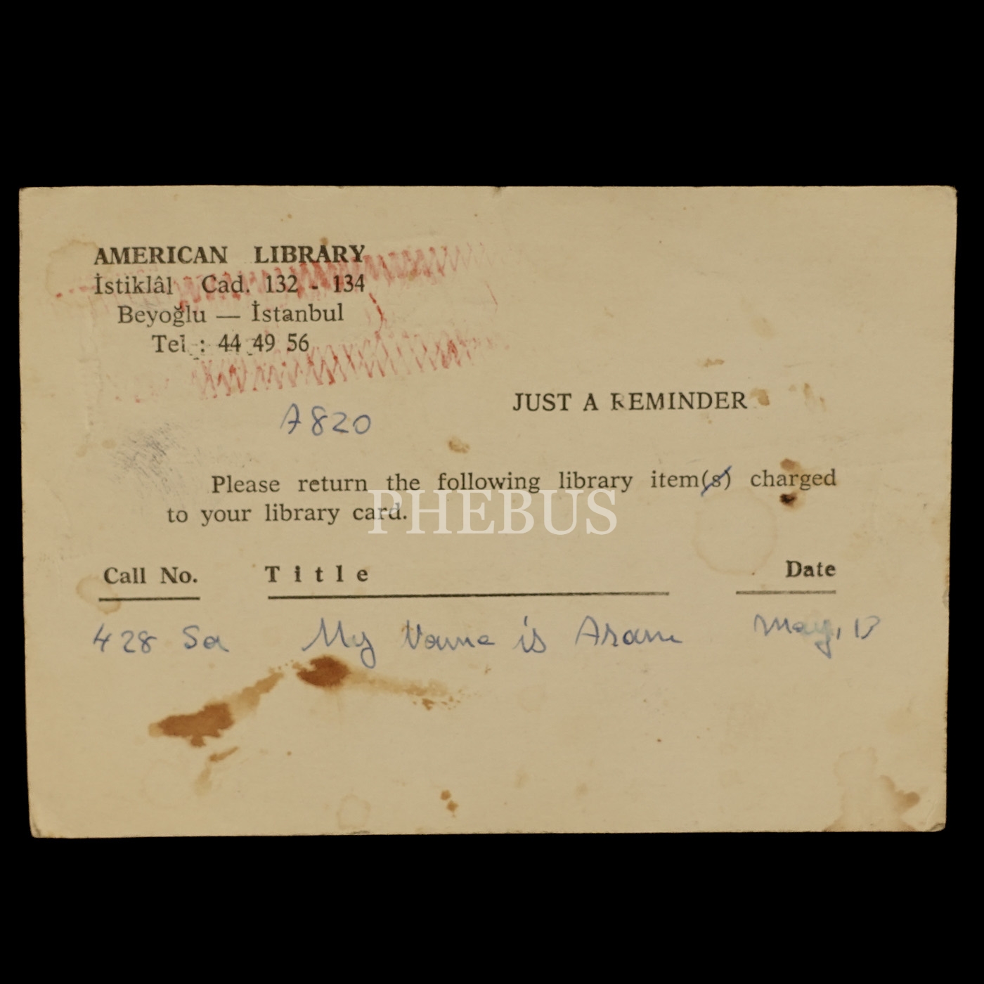 American Library (Beyoğlu, İstanbul) kütüphane kartı, Doniça Hamamciyan tarafından 1964 yılında alınan My Name is Aram (Benim Adım Aram, William Saroyan) kitabı için doldurulmuş, damgalı, 12x9 cm...