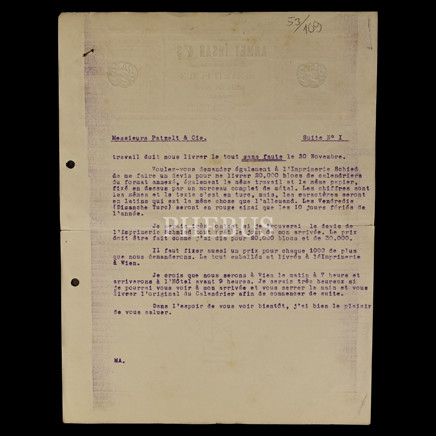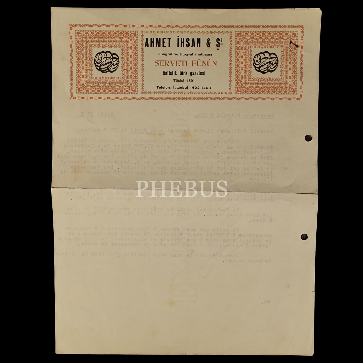 "Ahmet İhsan & Şi. (Tipograf ve Litograf Matbaası) - Serveti Fünûn" antetli, arka yüzü daktilo Fransızca mektuplu kâğıt, 21x28 cm...