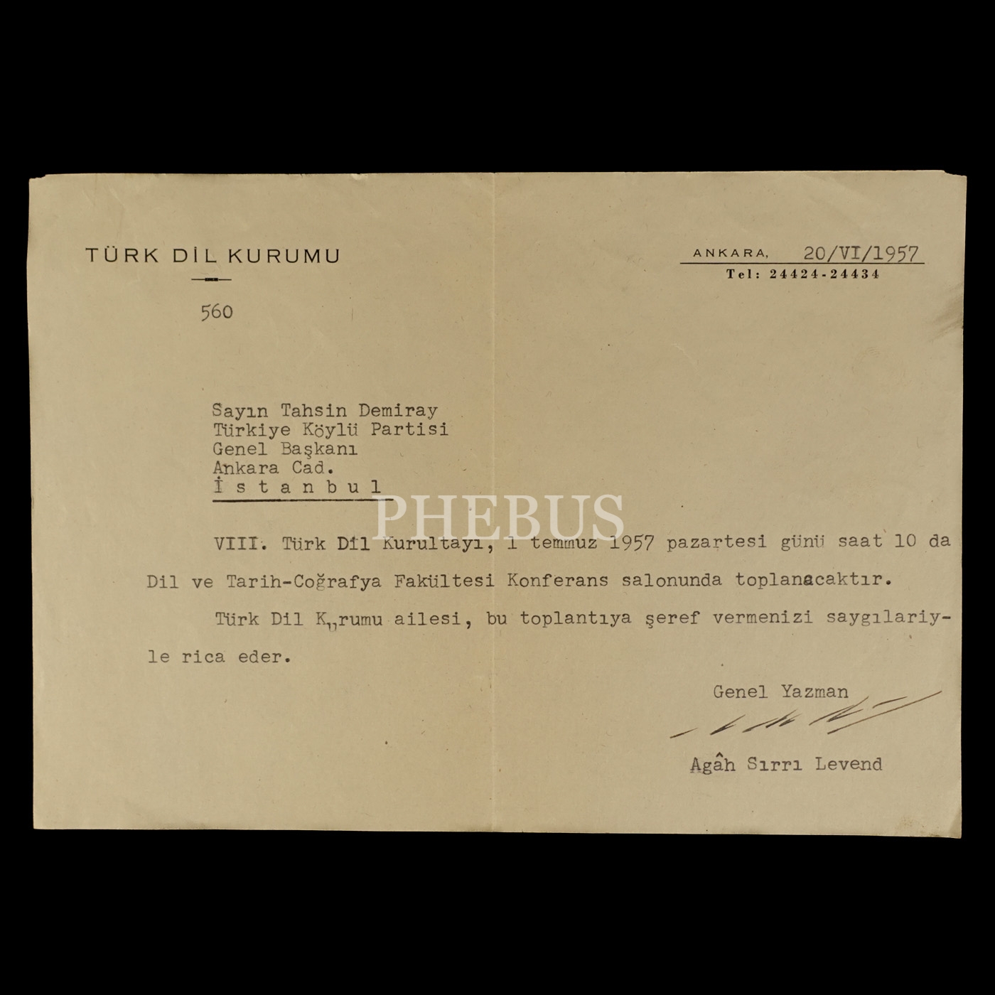 Türk Dil Kurumu Genel Yazmanı Agâh Sırrı Levend´in, Türkiye Köylü Partisi Genel Başkanı Tahsin Demiray´a gönderdiği, VIII. Türk Dil Kurultayı (1 Temmuz 1957) davetiyesi, Agâh Sırrı´dan ıslak imzalı, 21x15 cm...