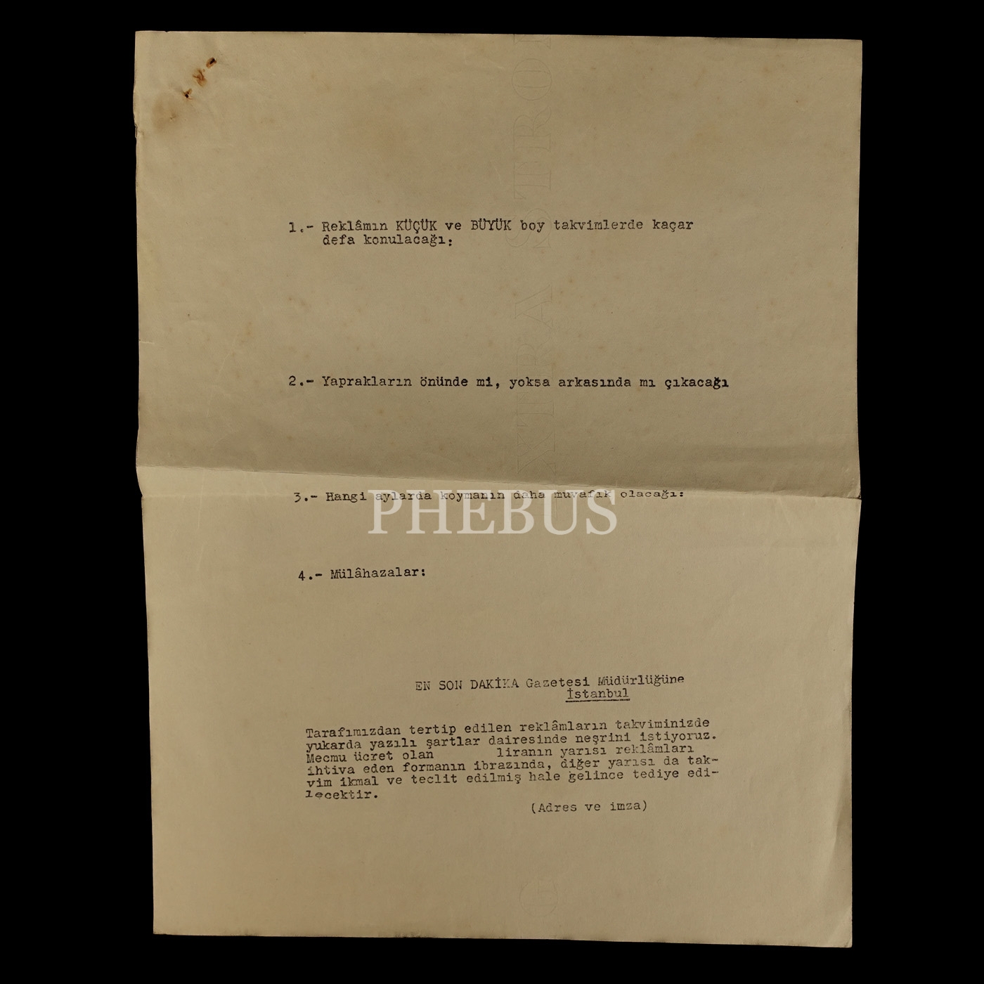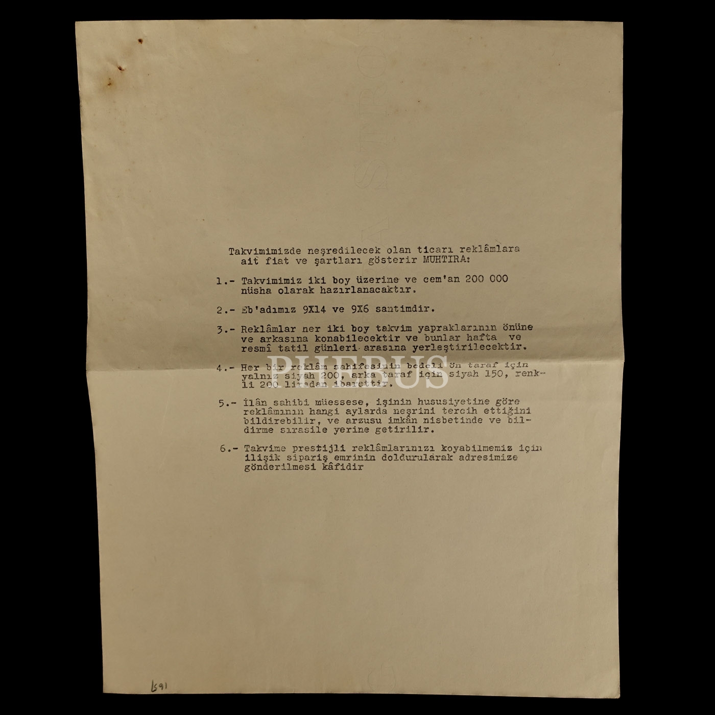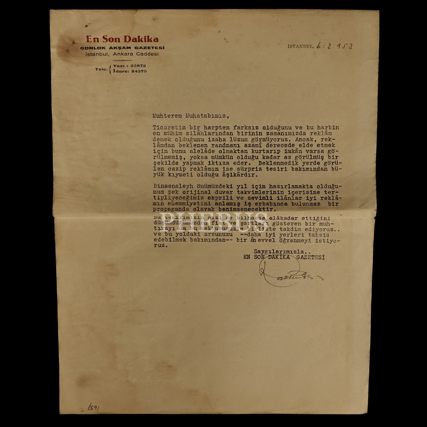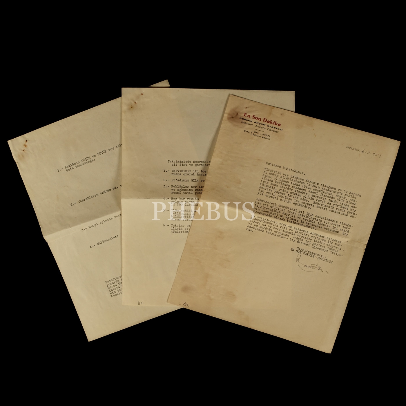 "En Son Dakika (Günlük Akşam Gazetesi)" antetli kâğıtla, potansiyel reklamverenlere gönderilmiş, yeni yıl için hazırlanacak duvar takviminin içeriğine dair daktilo bilgilendirme mektubu ve fiyat/şart ve sipariş muhtıraları (3 yaprak), 6 Şubat 1953, 23x30 cm...