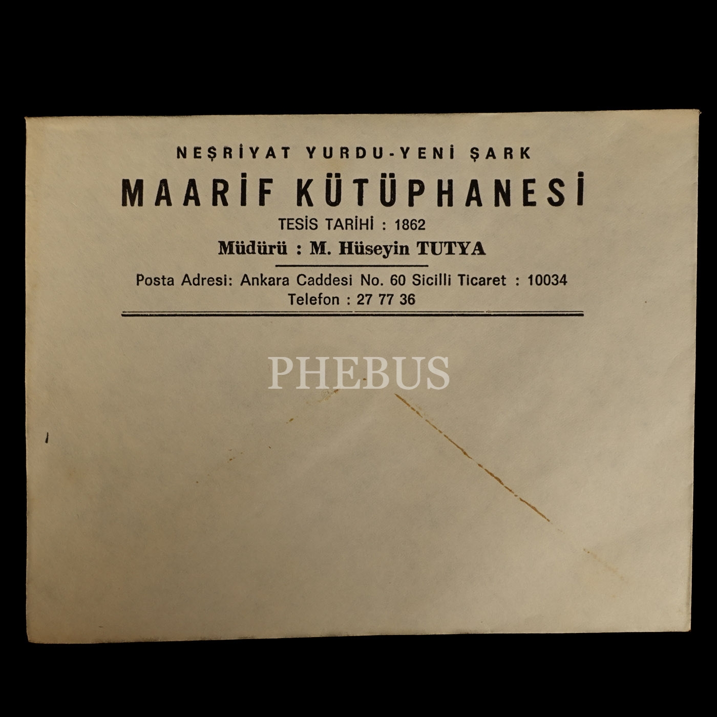 "Neşriyat Yurdu - Yeni Şark MAARİF KÜTÜPHANESİ (Müdürü: M. Hüseyin Tutya)" antetli boş zarf, 16x12 cm...