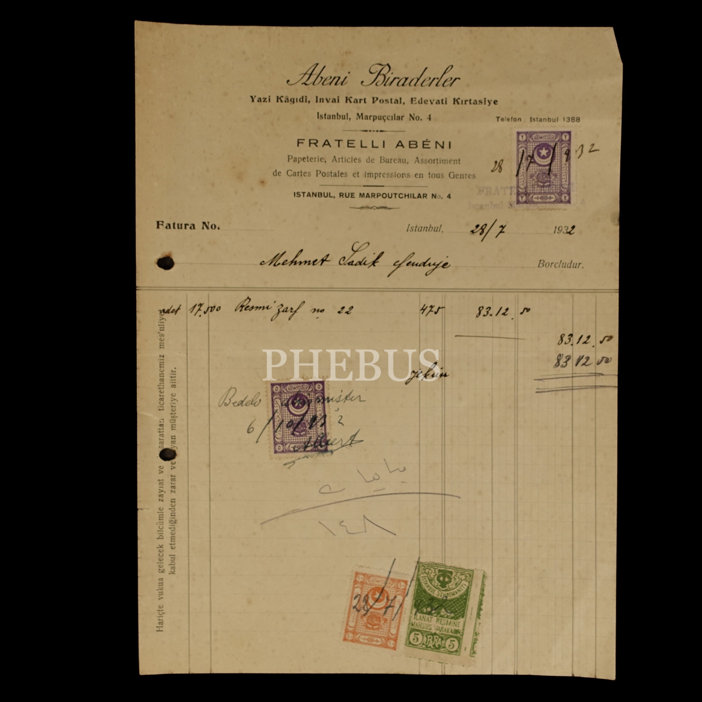 "Abeni Biraderler (Yazi Kâğıdi, Invai Kart Postal, Edevati Kırtasiye)" antetli, Afitap Mağazası sahibi Mehmet Sadık adına kesilmiş 28 Temmuz 1932 tarihli fatura, 20x27 cm...