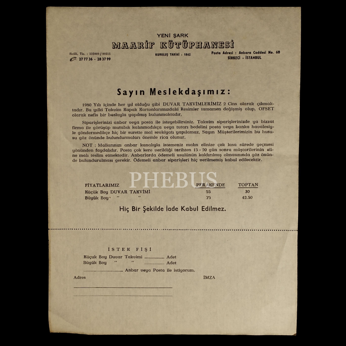 "Yeni Şark Maarif Kütüphanesi" antetli kâğıda kaleme alınmış, 1980 duvar takvimi siparişlerine dair daktilo bilgilendirme mektubu, 16x23 cm...