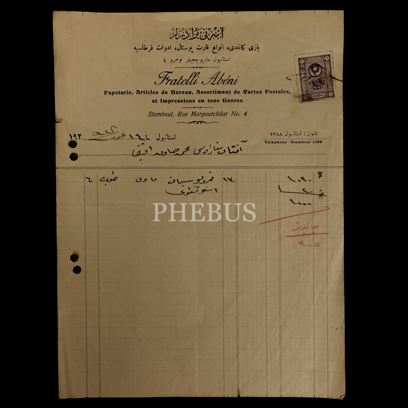 "Abeni Biraderler (Yazi Kâğıdi, Invai Kart Postal, Edevati Kırtasiye)" antetli, Afitap Mağazası sahibi Mehmet Sadık adına kesilmiş 14 Ağustos 1918 tarihli fatura, 20x27 cm...