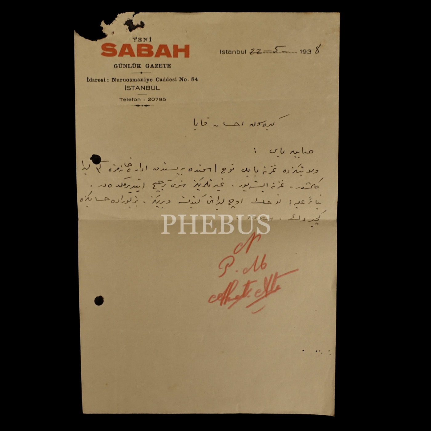 "Yeni Sabah Günlük Gazete" antetli kağıt üzerine Giresun´da İhsan Kaya´ya hitaben kaleme alınmış mektup, 22 Mayıs 1938, 15x23 cm...
