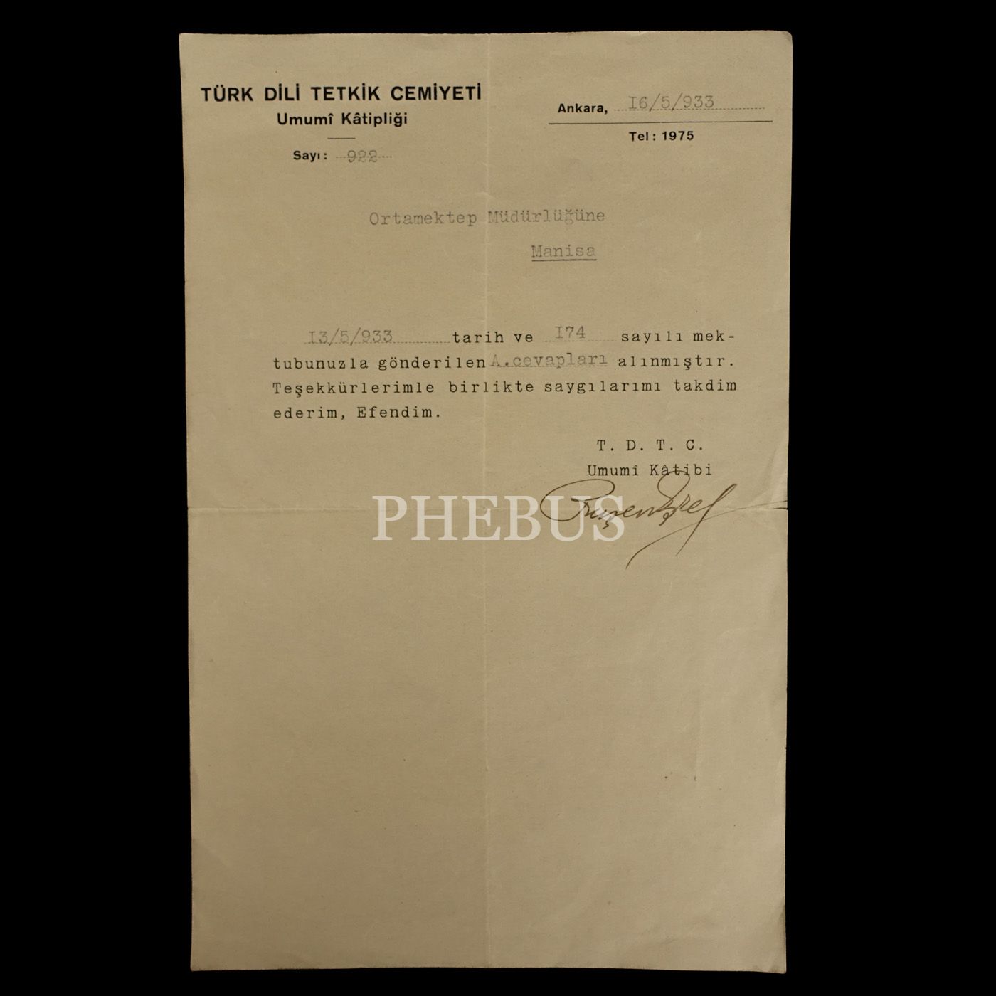 Türk Dili Tetkik Cemiyeti Umumi Katibi Ruşen Eşref Ünaydın´ın ıslak imzasını taşıyan, "Türk Dili Tetkik Cemiyeti Umumi Katipliği" antetli evrak, 16 Mayıs 1933, 15x23 cm...