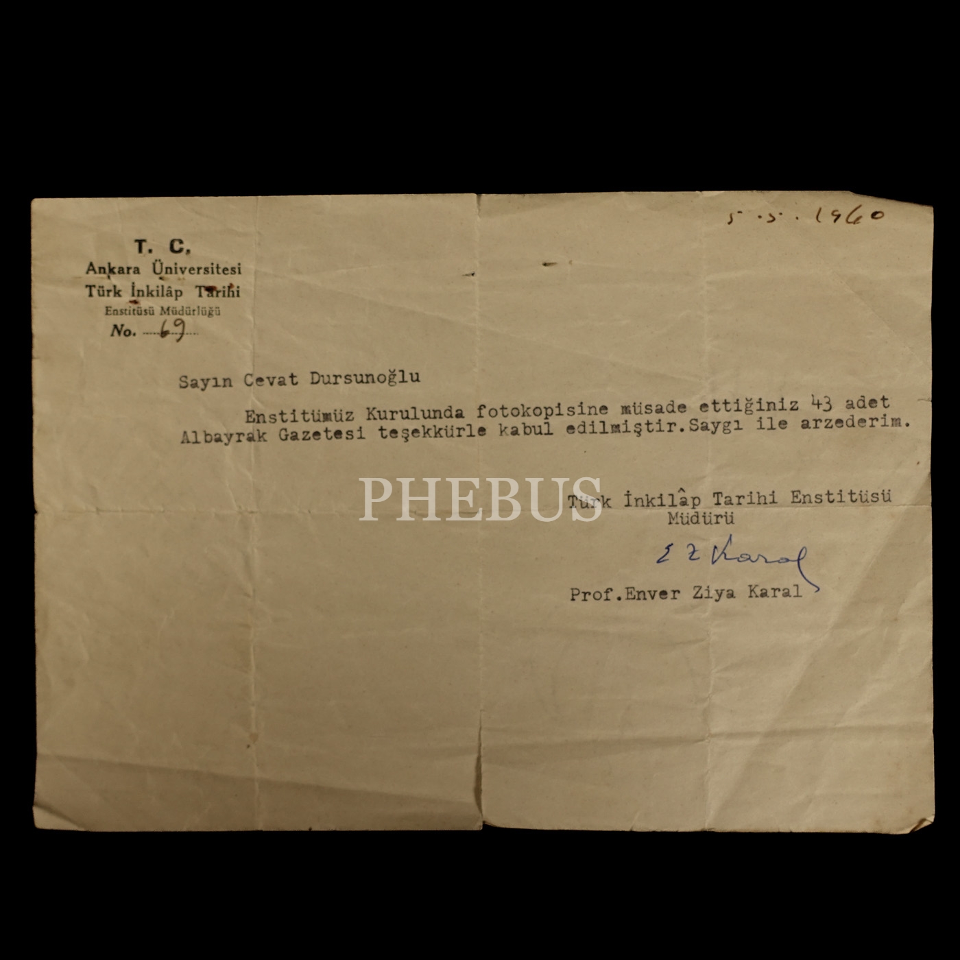 "T.C. Ankara Üniversitesi Türk İnkılap Tarihi Enstitüsü Müdürlüğü" antetli kağıt üzerine enstitü müdürü Enver Ziya Karal´ın, Cevat Dursunoğlu´na hitaben kaleme aldığı 1960 tarihli mektubu, 20x15 cm...