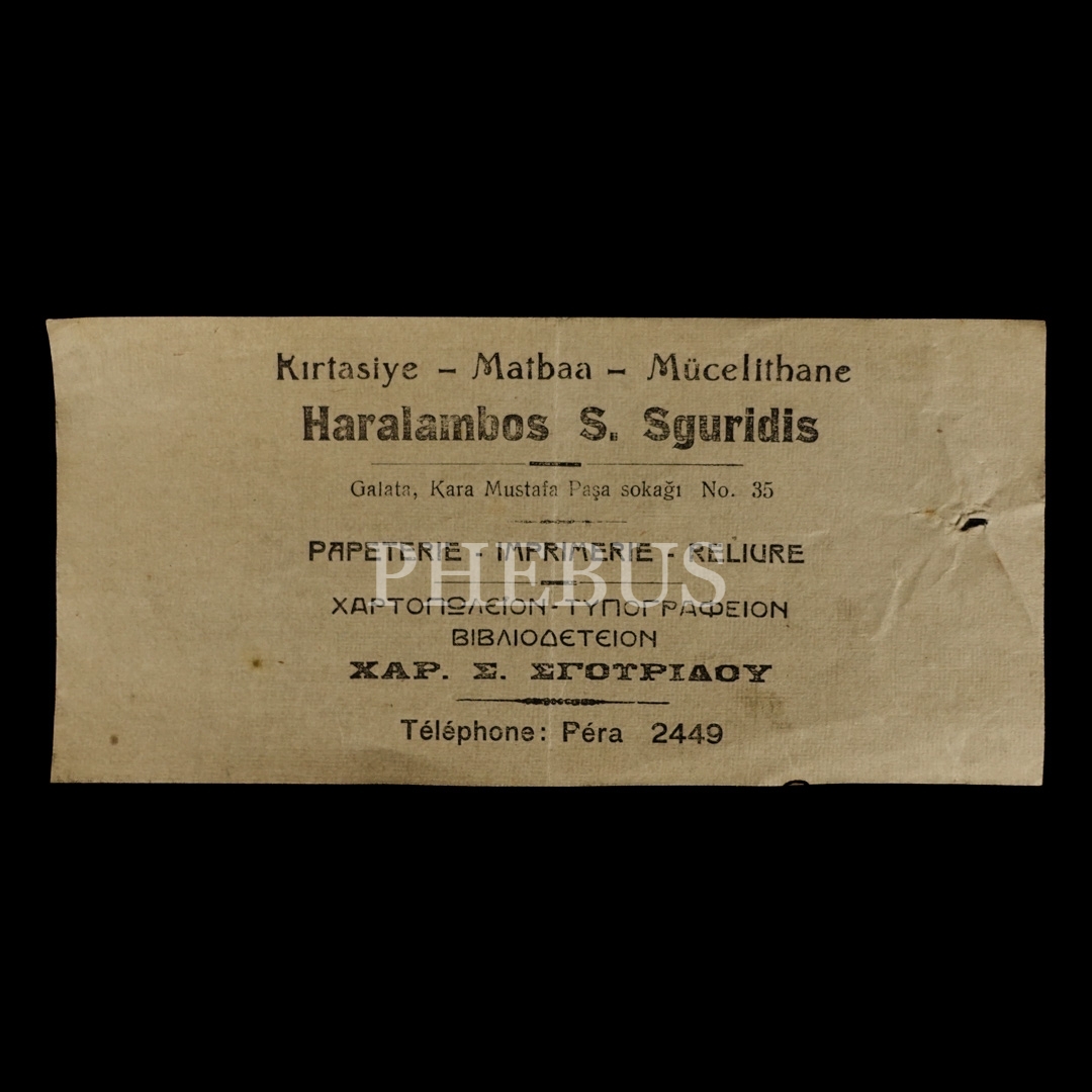 "Haralambos S. Sguridis (Kırtasiye - Matbaa - Mücelithane)" antetli, üç dilde el ilanı, 17x8 cm...