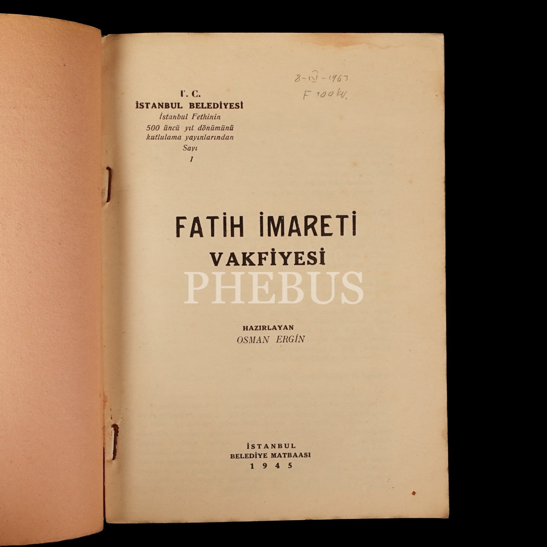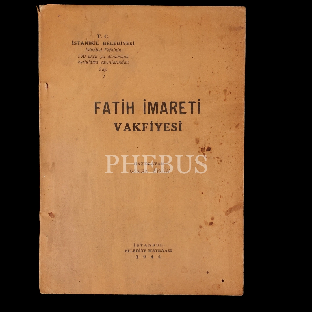 FATİH İMARETİ VAKFİYESİ (hazırlayan: Osman Ergin), 1945, Belediye Matbaası, 68 sayfa, 17x24 cm...