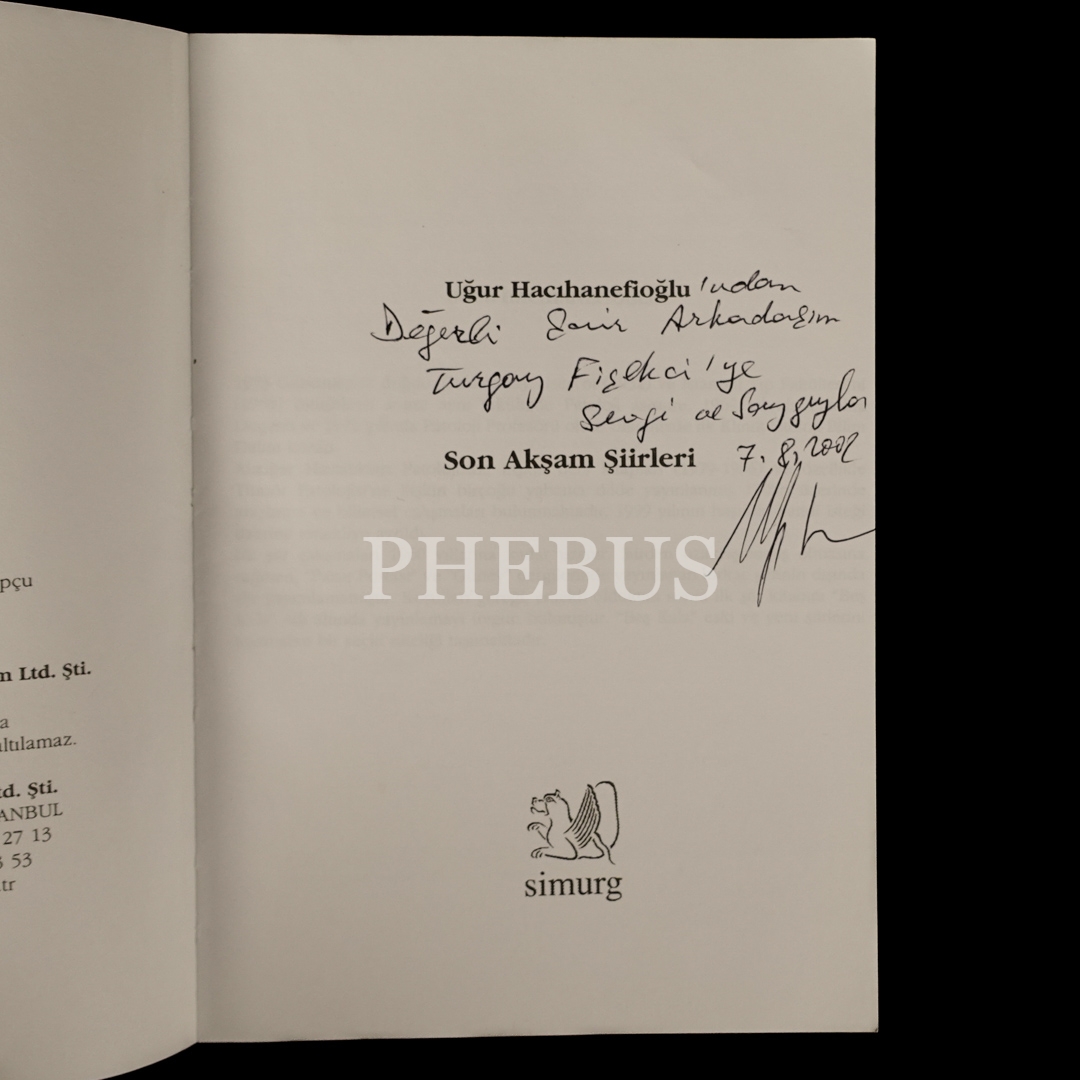 "Uğur Hacıhanefioğlu´ndan değerli şair Turgay Fişekçi´ye sevgi ve saygılar." ithafıyla imzalıdır.