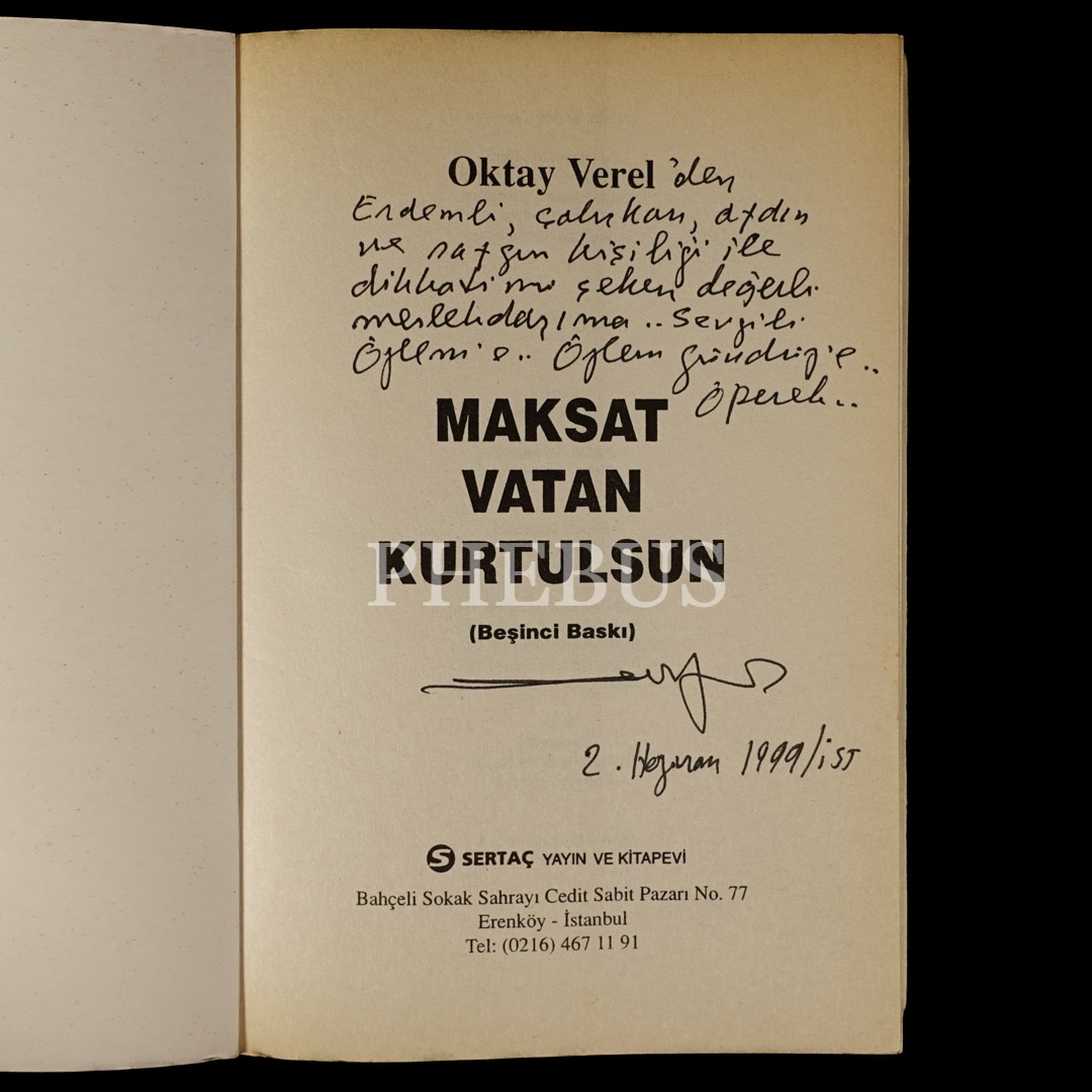 "Oktay Verel´den erdemli, çalışkan, aydın ve saygın kişiliği ile dikkatimi çeken değerli meslekdaşıma... Sevgili Özlem´e... Özlem Gündüz´e... Öperek..." ithafıyla imzalıdır.