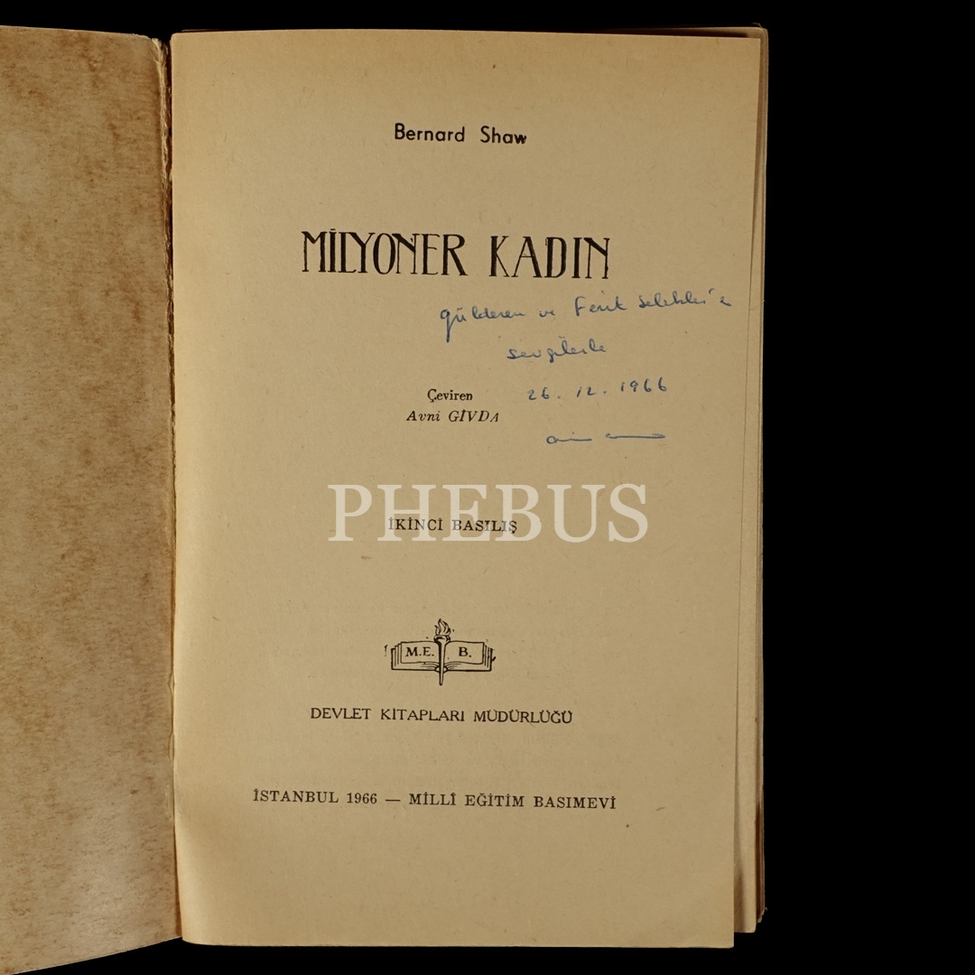 MİLYONER KADIN, Bernard Shaw, (çeviren: Avni Givda), 1966, Millî Eğitim Basımevi, 106 sayfa, 12x18 cm...