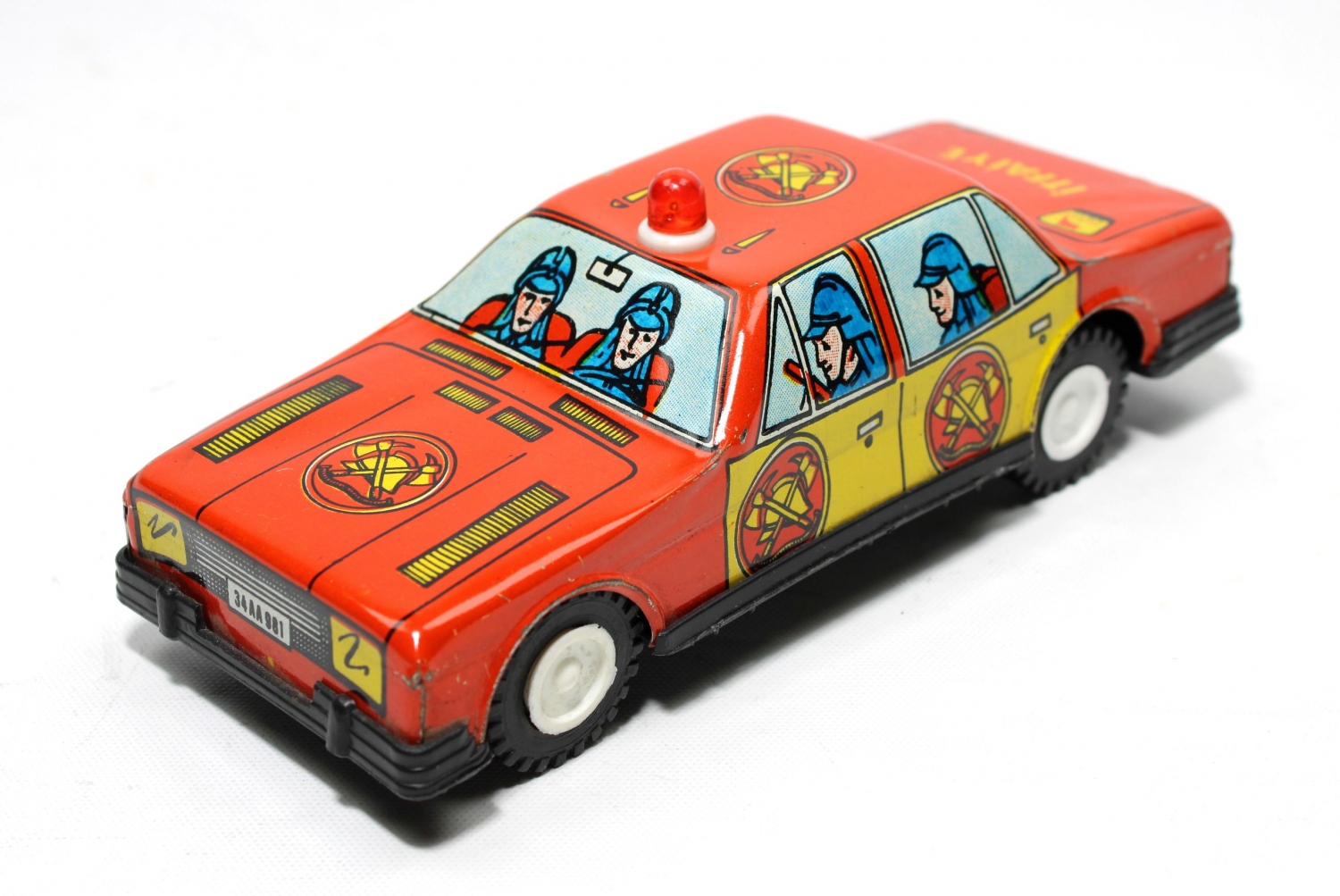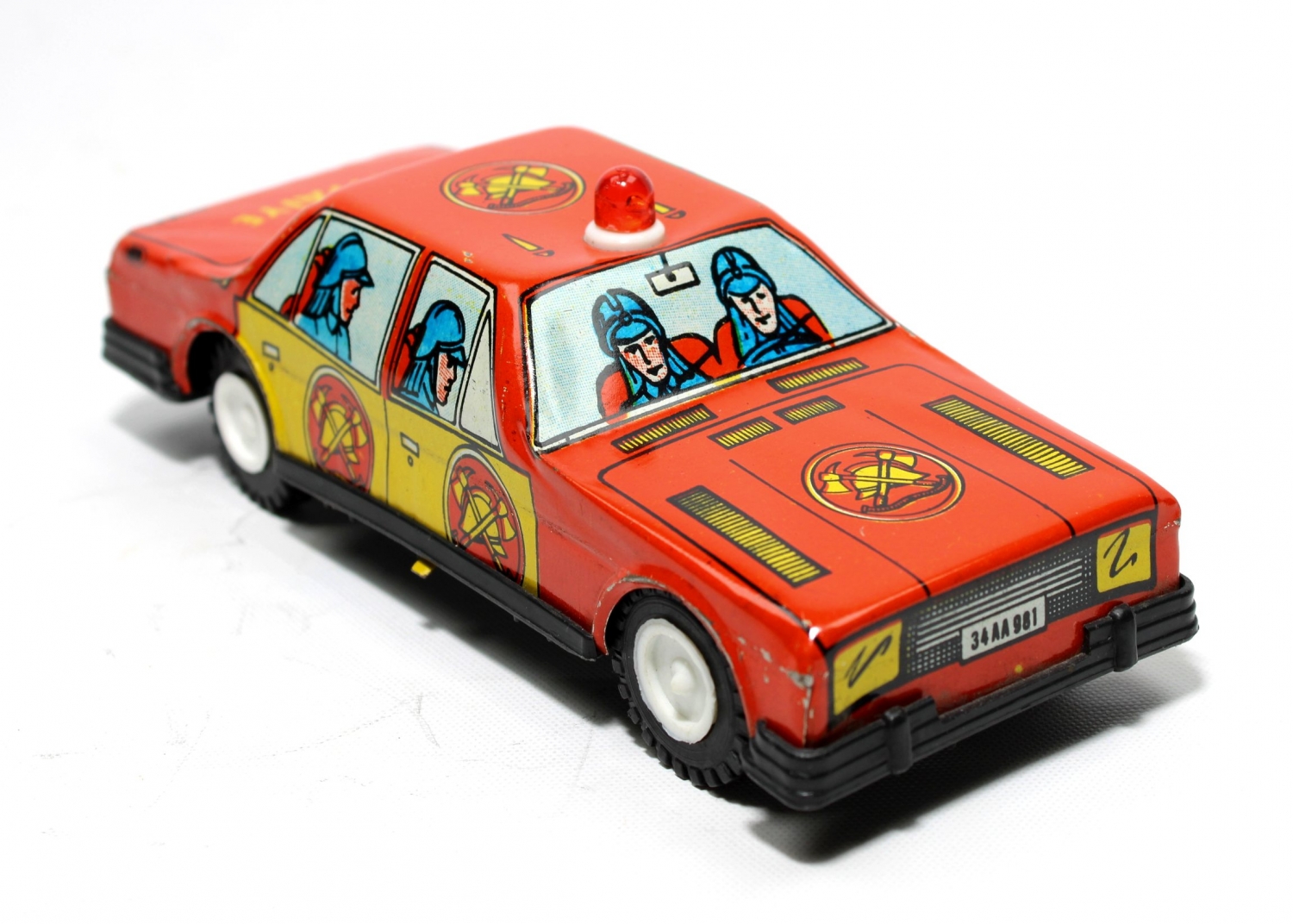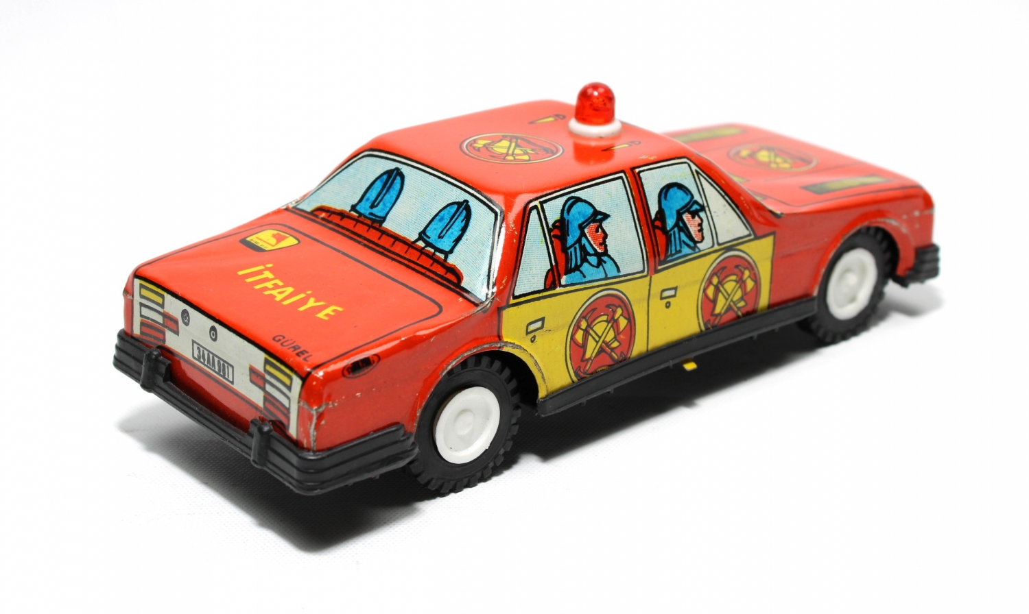 Türk Malı, Gürel marka, Petrol Ofisi reklamlı teneke itfaiye aracı, kırmızı tepe lambalı, 7x18x6 cm