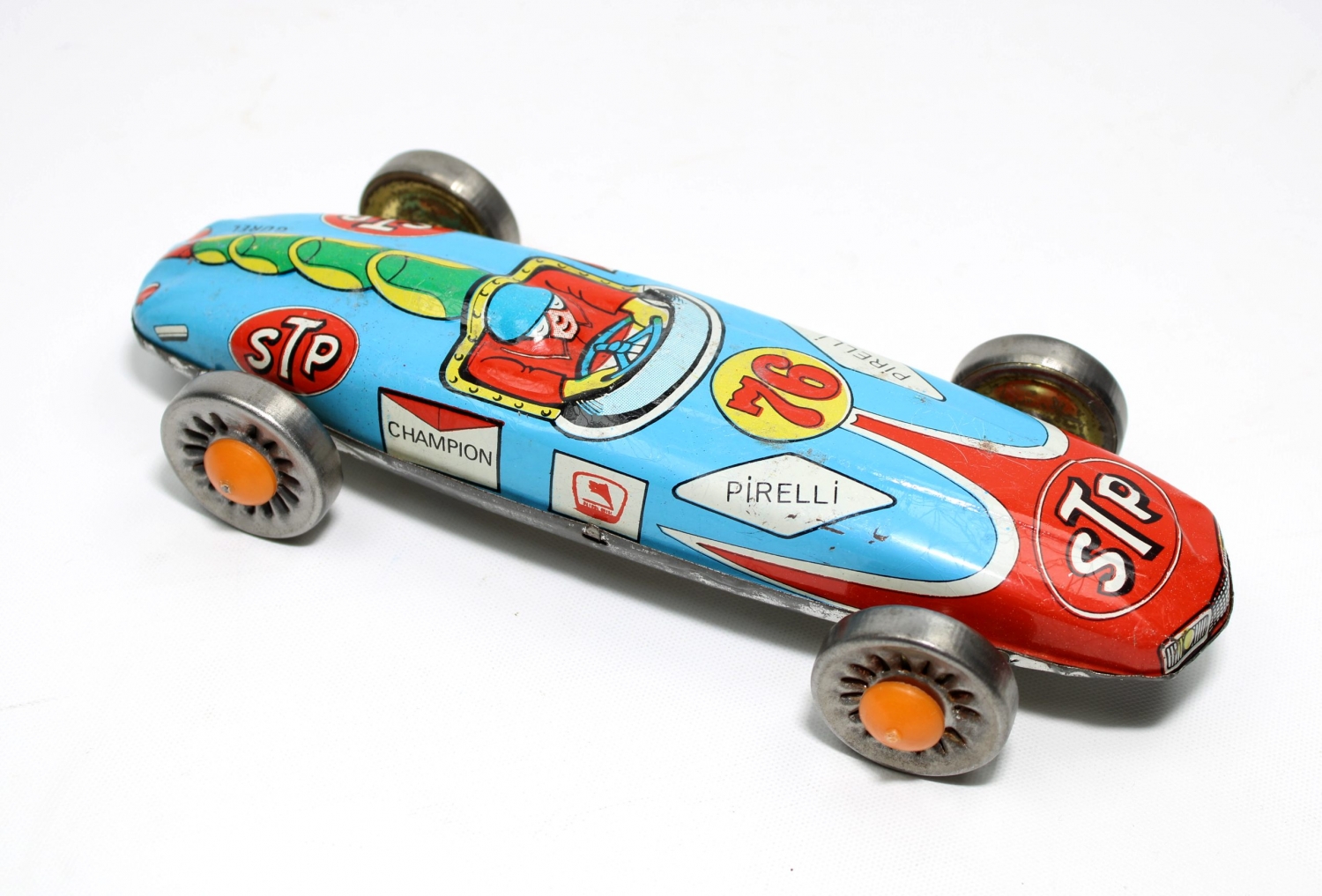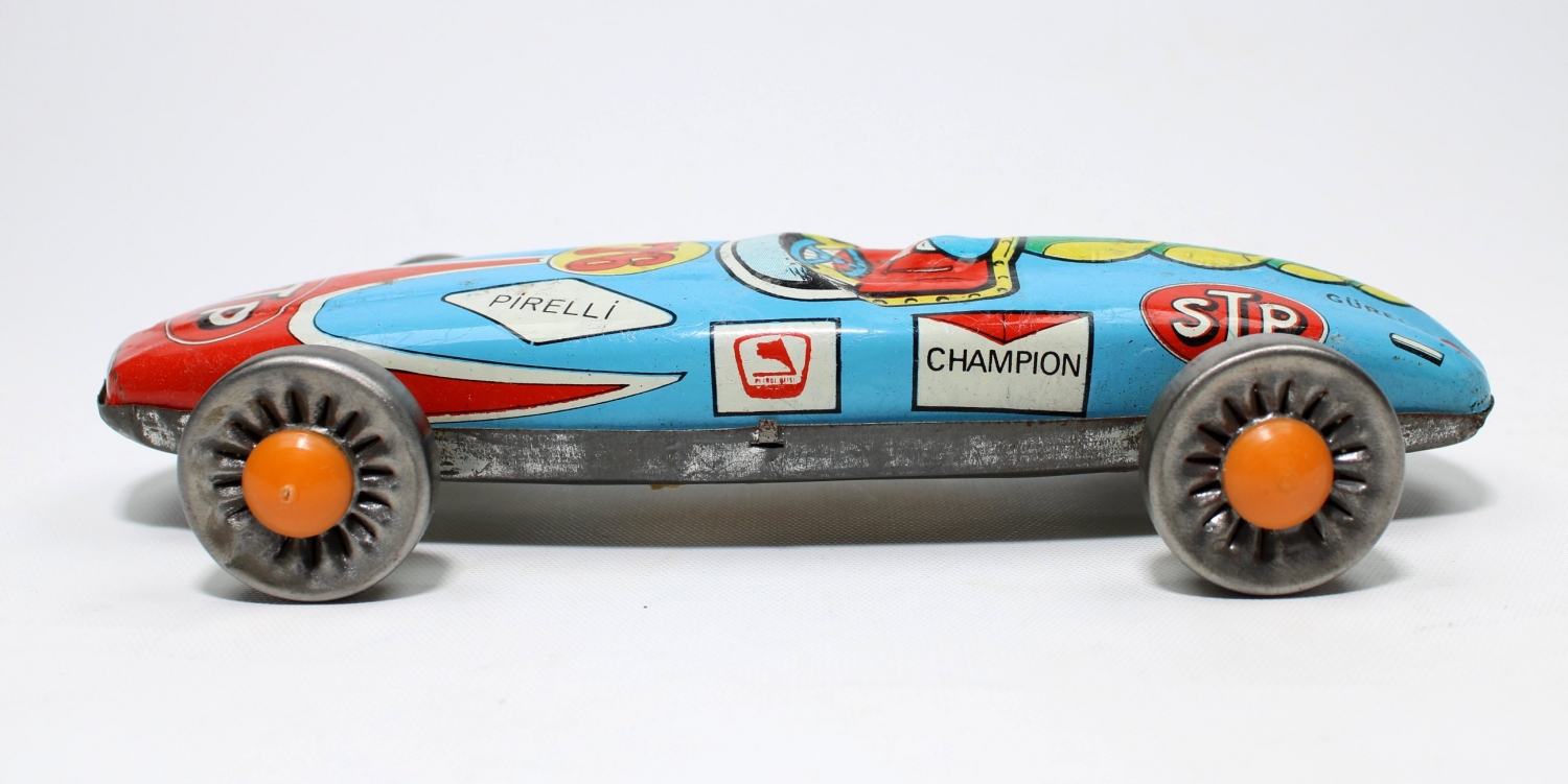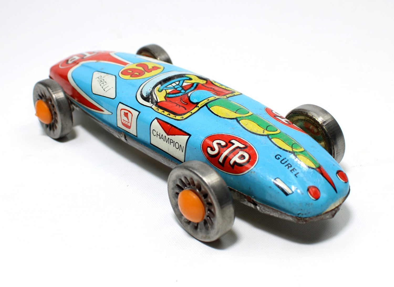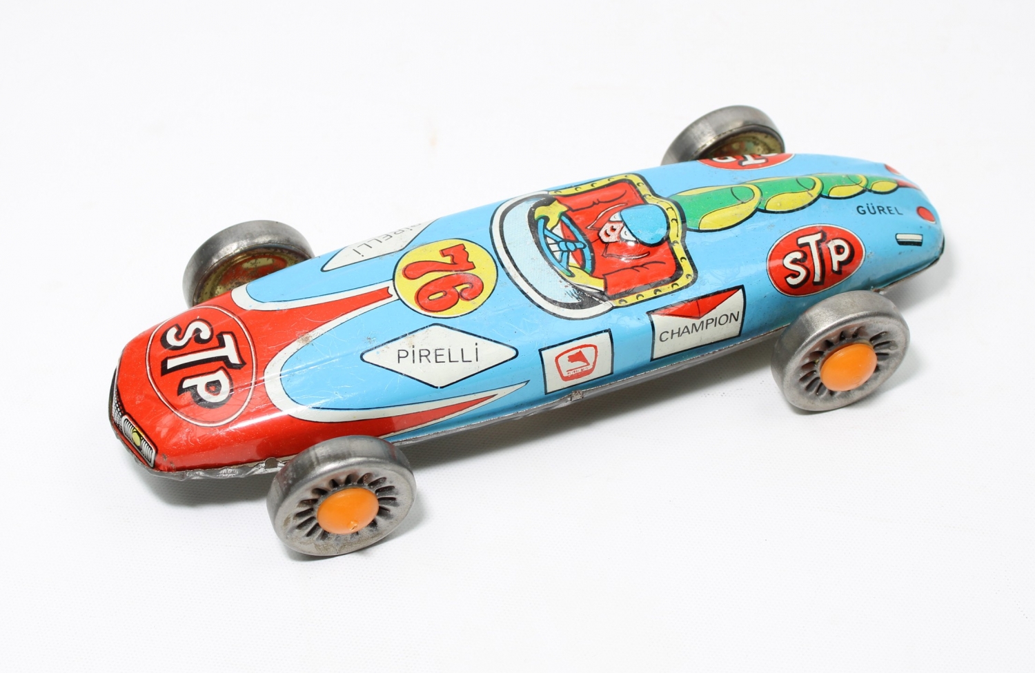 Türk Malı, Gürel marka, Petrol Ofisi reklamlı, Pirelli teneke yarış arabası, 10x24x5 cm