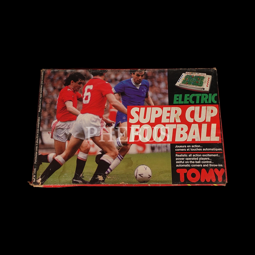 Kullanma kılavuzunun da yer aldığı orijinal kutusunda Tomy marka elektrikli futbol oyunu, "Electric Super Cup Football", Made in Singapore (Singapur), kutu 38x24x8 cm...