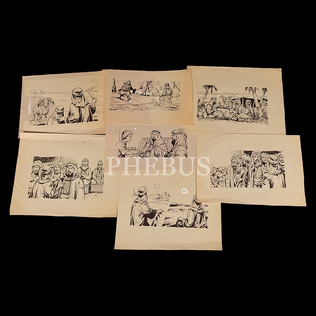 Kâğıt üzeri çini boyayla hazırlanmış çizgi roman sahneleri (7 adet), imzasız, ortalama 20x12 cm...
