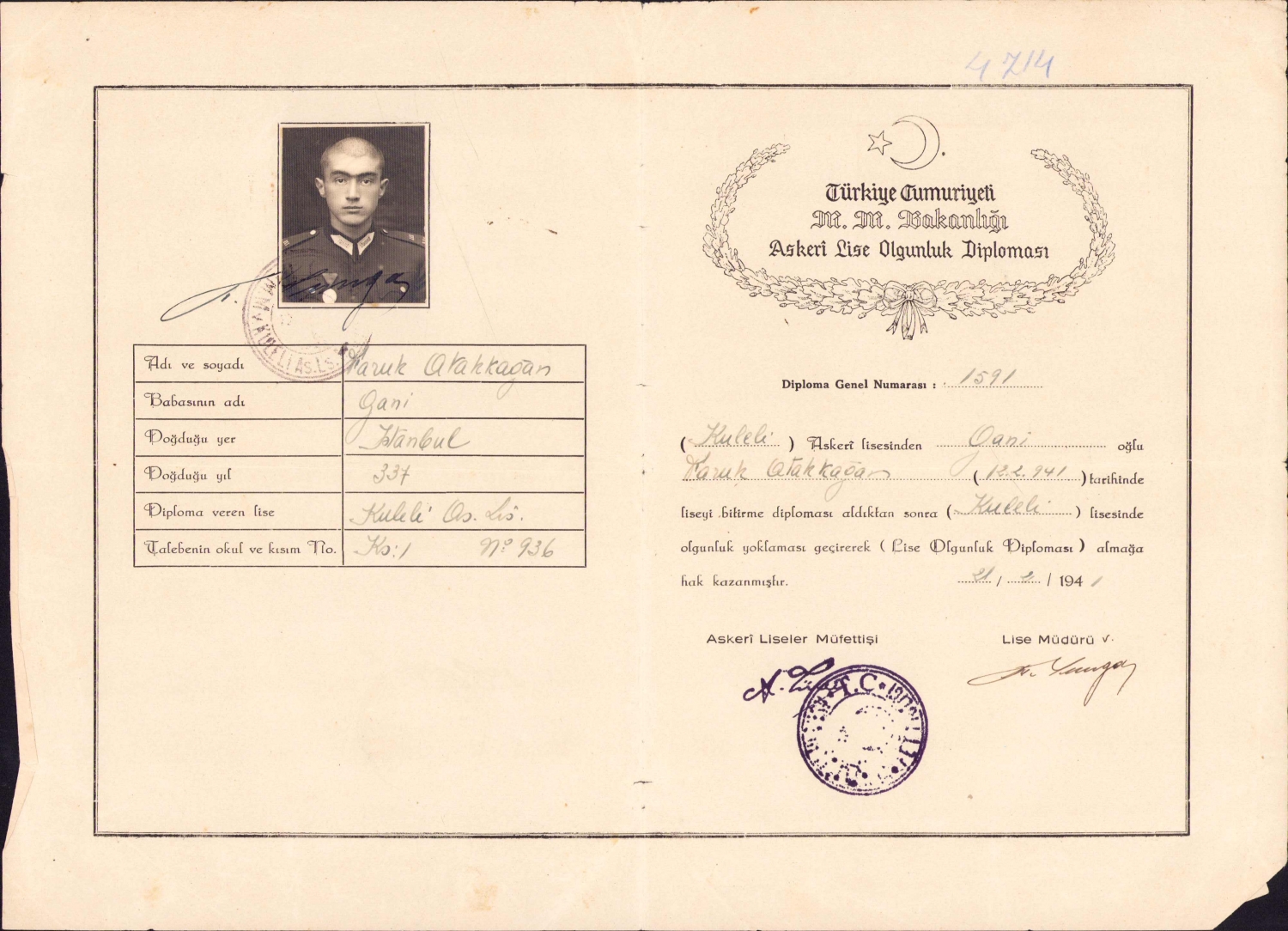 Harp Okulu Askeri Lise Olgunluk Diploması, orjinal kabında, 33x23 cm