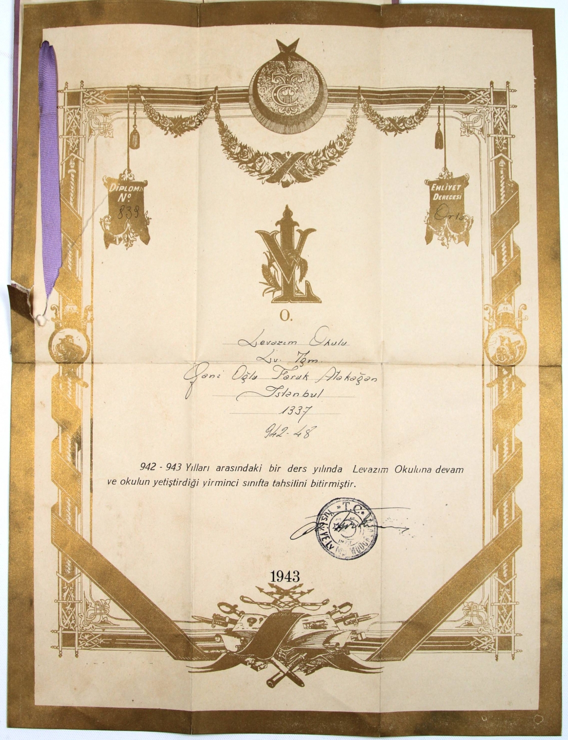 Levazım Okulu diploması, 1943, orjinal kabında, 30x40 cm