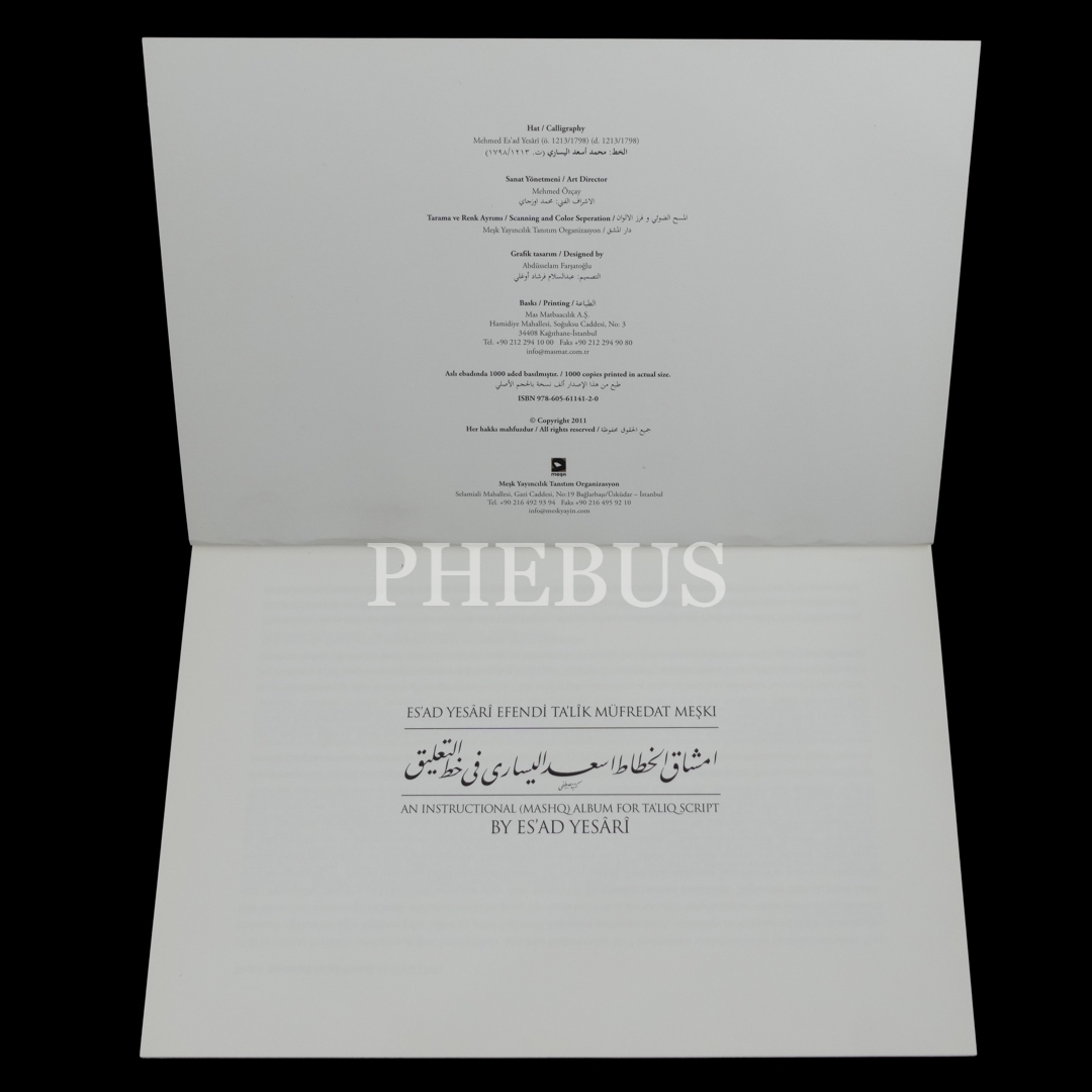 ESAT YESARİ EFENDİ'NİN TA'LİK MÜFREDAT MEŞKİ, (Sanat yönetmeni: Mehmet Özçay), 2011, Meşk Yayıncılık, 14x20 cm...