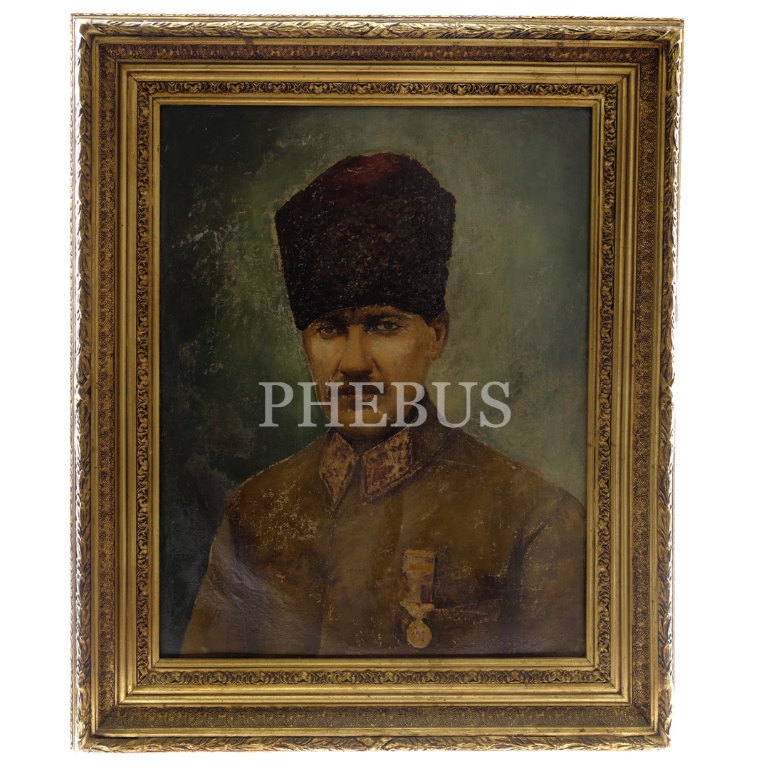 Mustafa Kemal Atatürk´ün, kimliği tespit edilemeyen usta bir ressam tarafından, mareşal üniforması ve İstiklal Madalyası ile tasvir edildiği, mukavva üzerine yağlıboya portresi; 43x55 cm, çerçeve 61x74 cm...