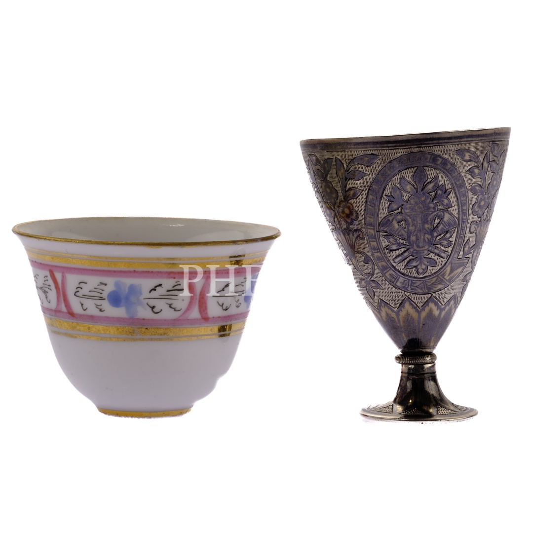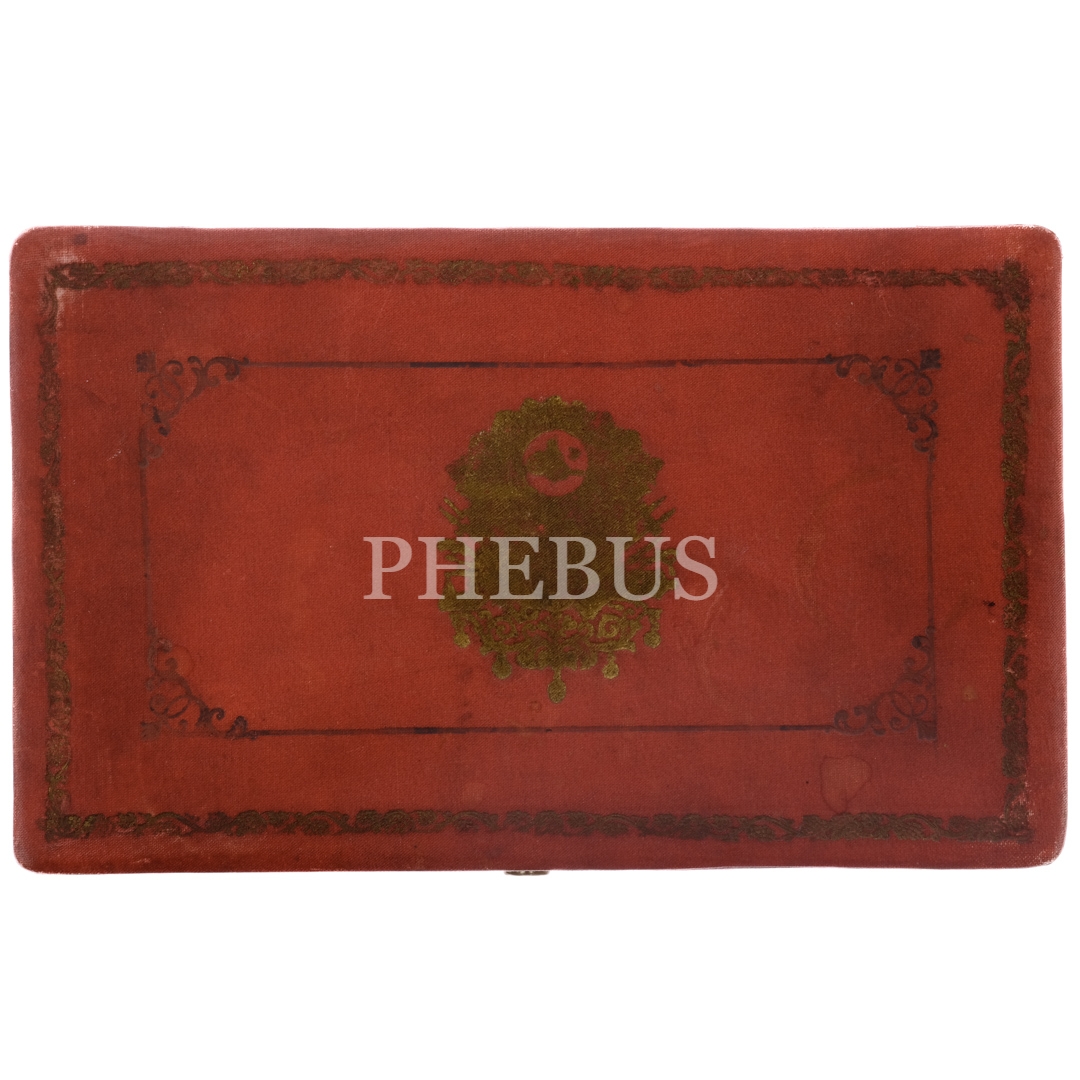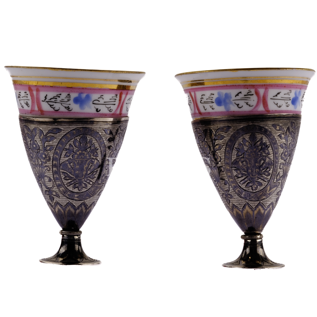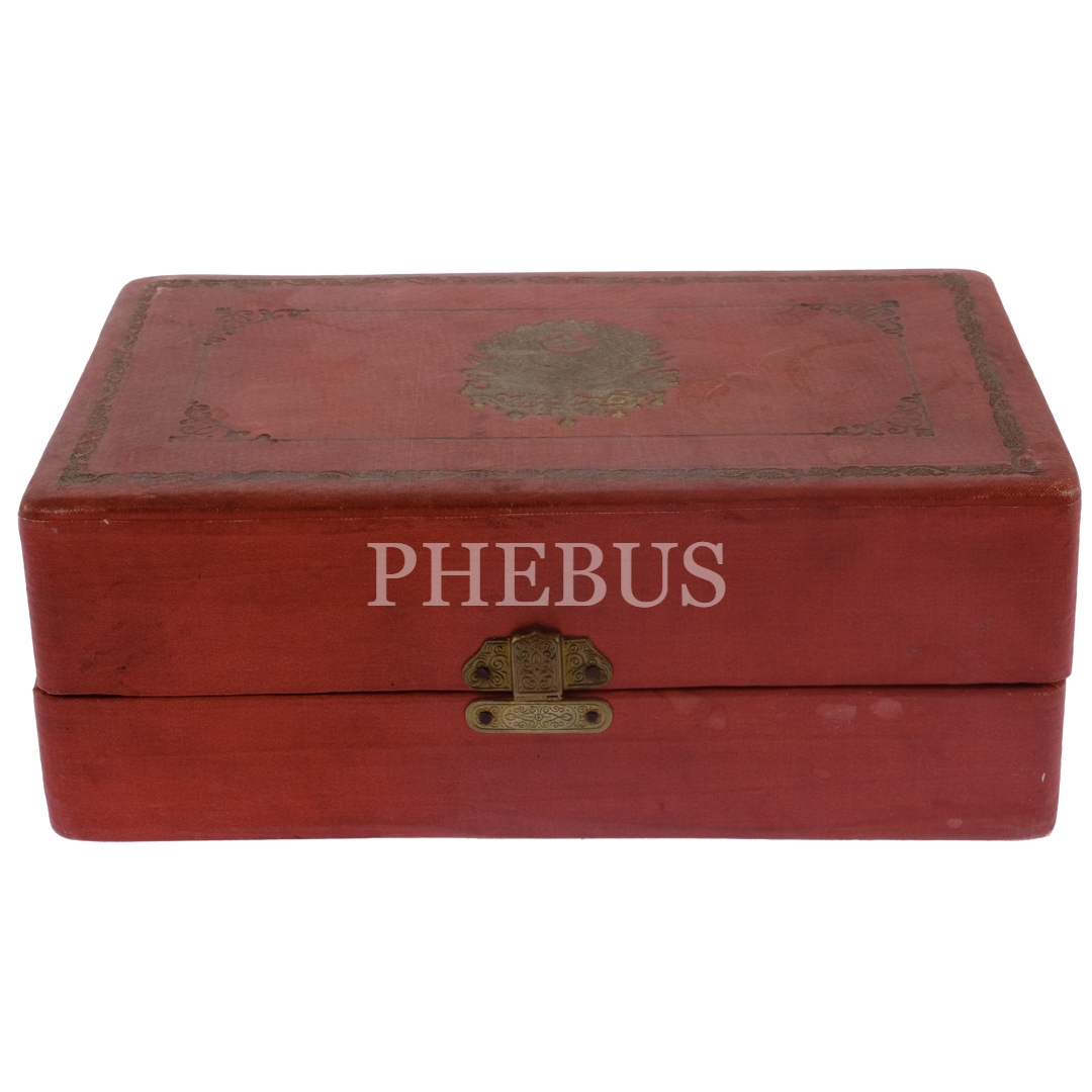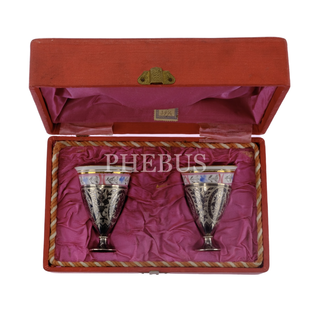 Osmanlı devlet armalı orijinal kutusunda, bir çift savatlı gümüş zarf ve Czerney (Constantinople) marka fincan seti, fincanlar (zarflarıyla birlikte) 7x5,5 cm, kutu 20x13x7,5 cm...