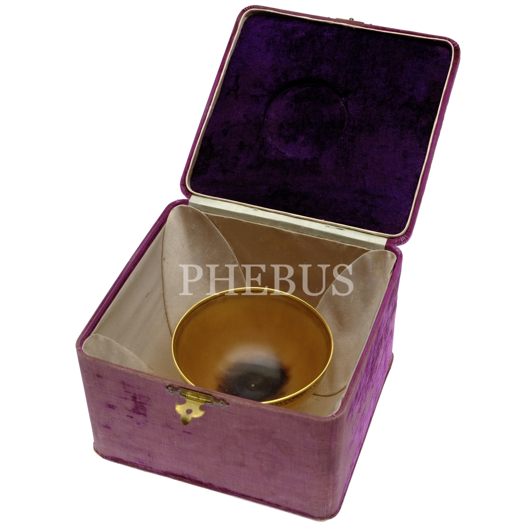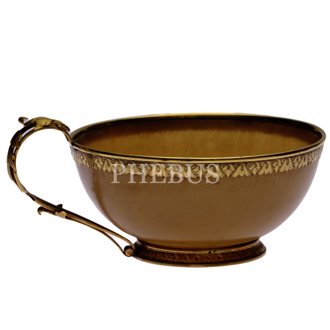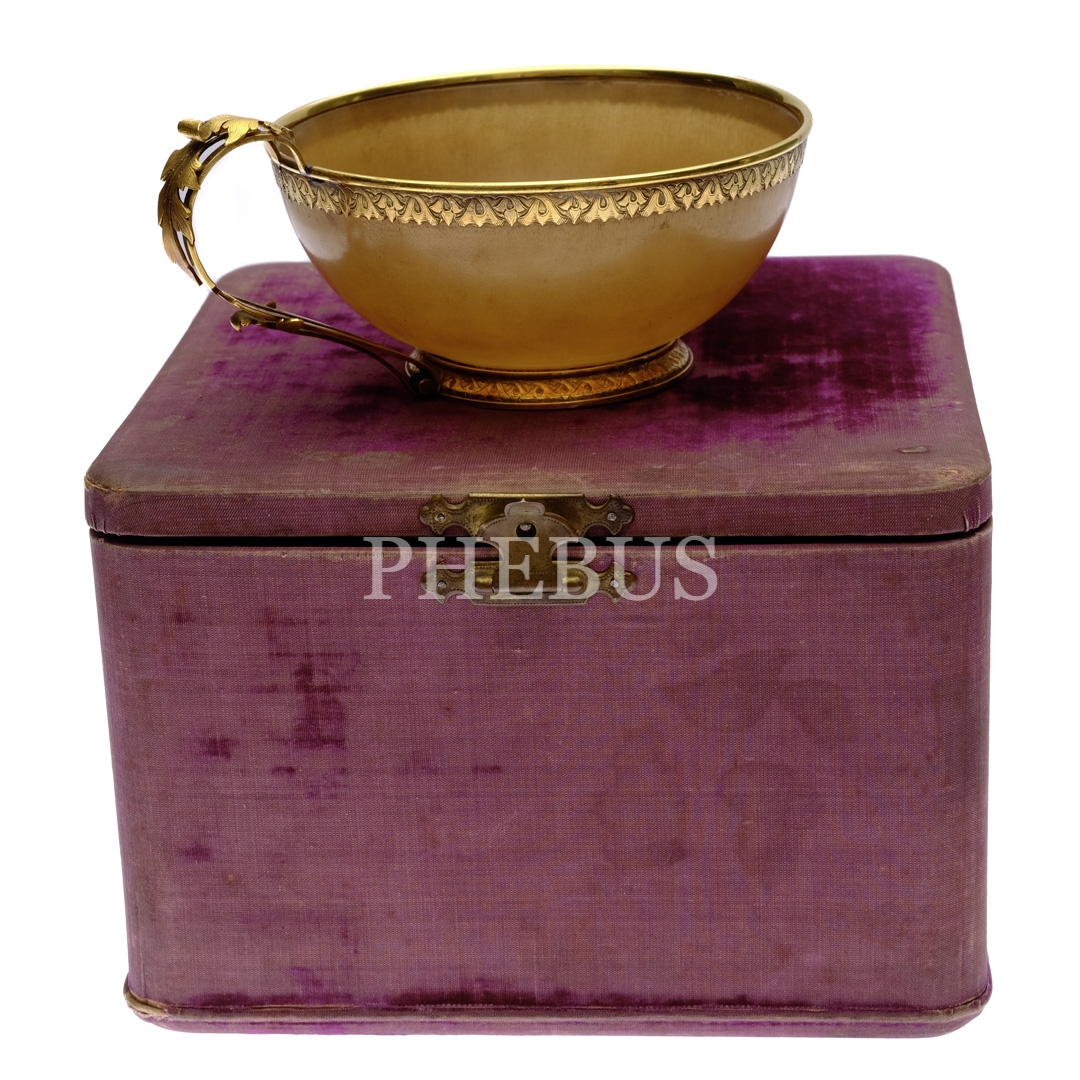 Saray tedarikçisinin “Constantinople” ibareli orijinal kutusunda, 18 ayar çift altın yaldız kuşaklı, kulp bölümü altın yaprak dekorlu çamçak, çamçak 14x6 cm, kutu 21x20x13 cm...
