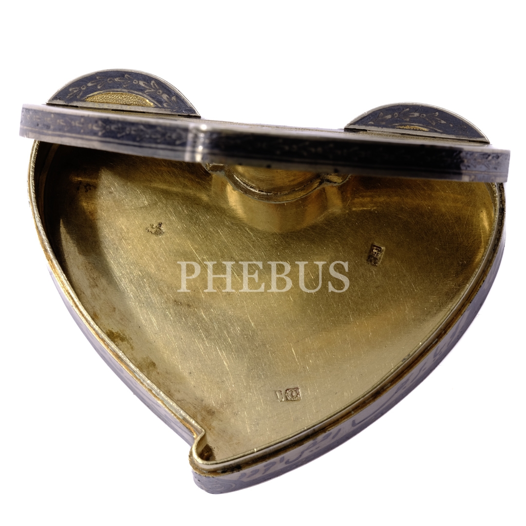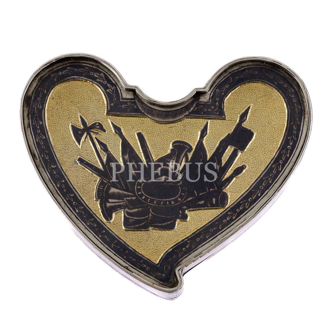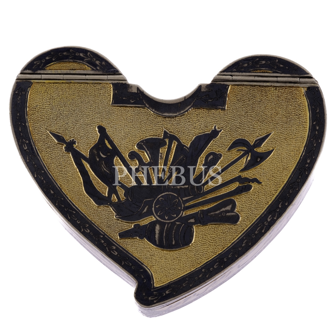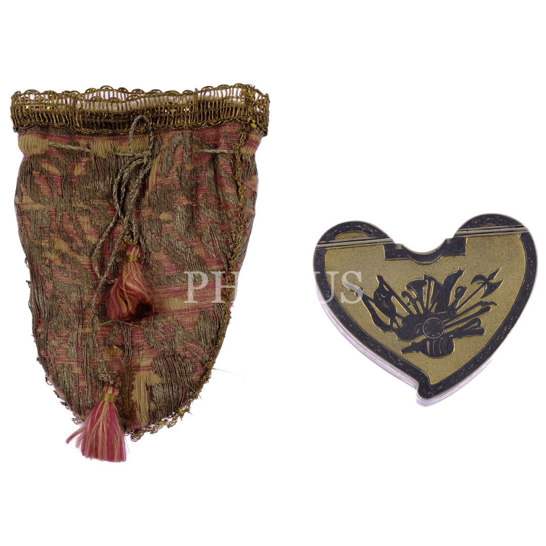 Savat işçilikli, kalp formunda gümüş kutu ve sırma işçilikli bez çantası; kutu 9x7 cm, bez çanta 10x15 cm...