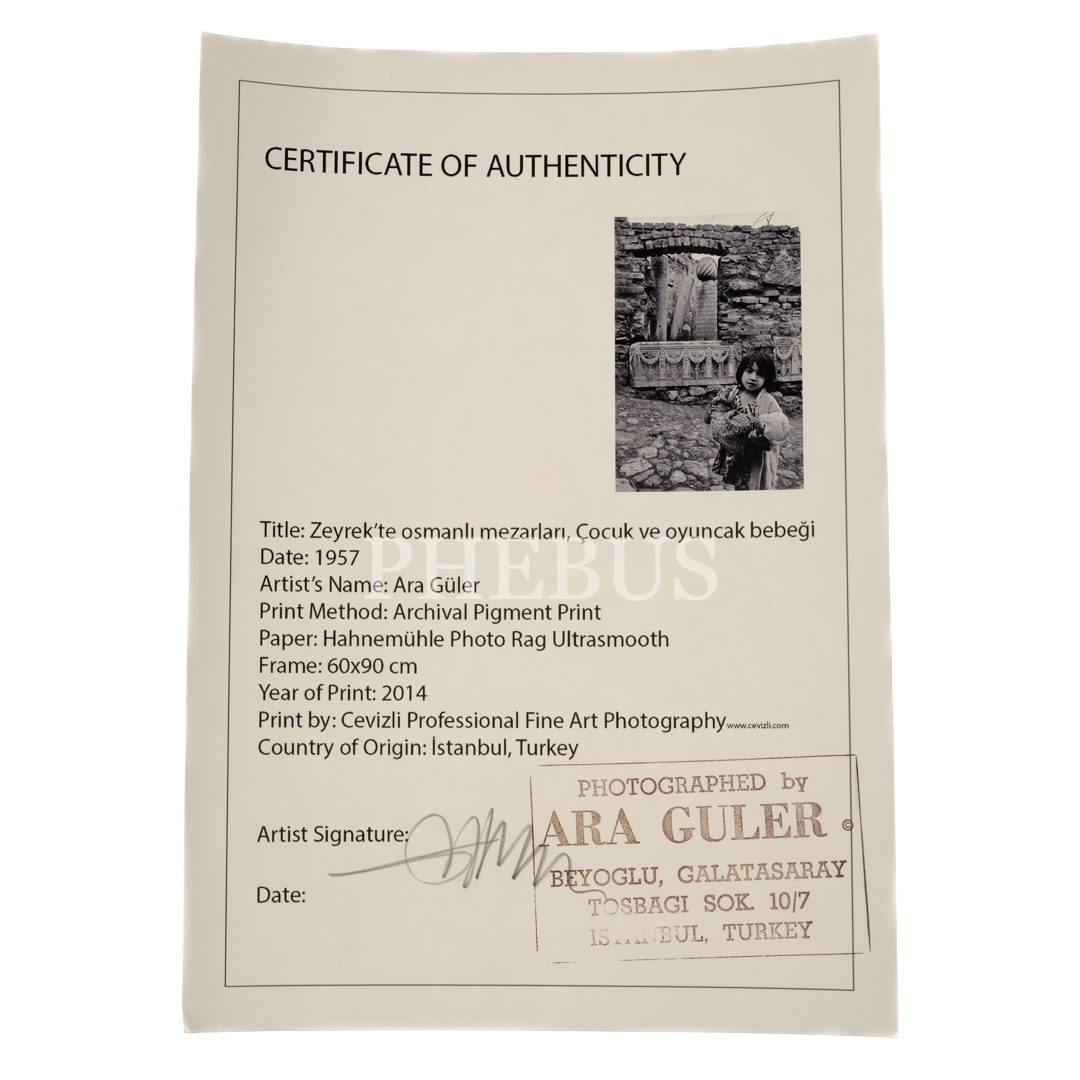 Zeyrek´te Osmanlı Mezarları, Çocuk ve Oyuncak Bebeği (1957), Ara Güler´den ıslak imzalı fotoğraf ve imzalı - kaşeli sertifika (2014), fotoğraf 54x82 cm, çerçeve 70x97 cm...