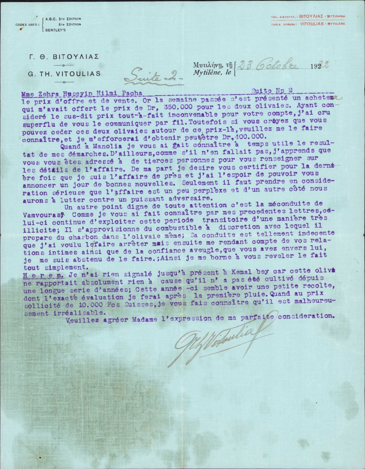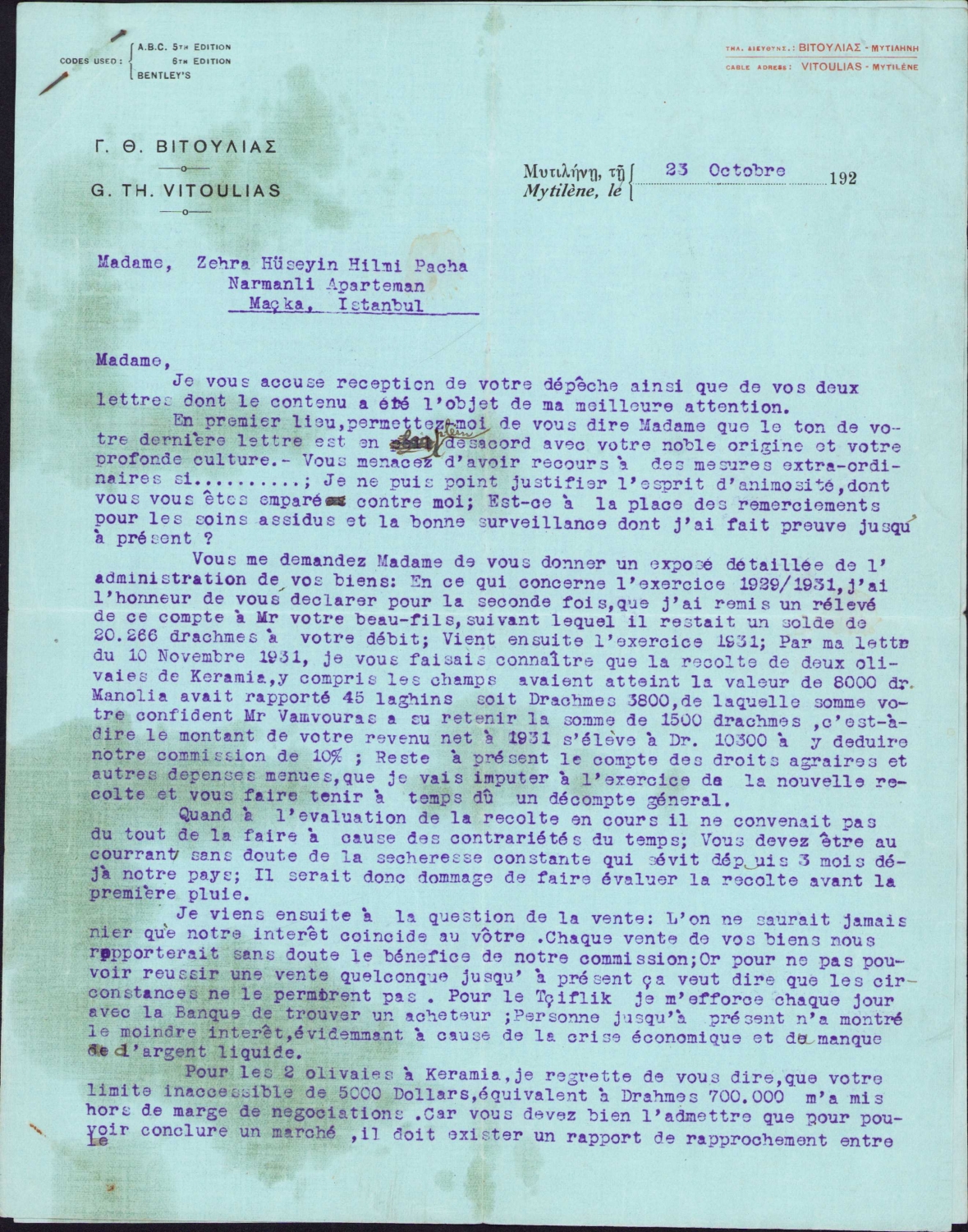 Midilli'den Zehra,Hüseyin Hilmi Paşa'ya gönderilen doküman, 1932 tarihli, 2 sayfa, 20x28 cm