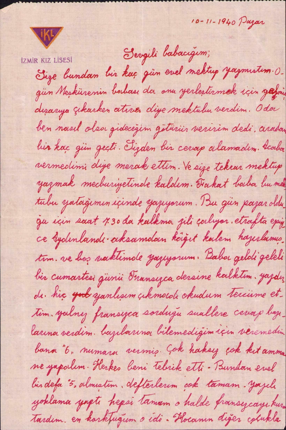İzmir Kız Lisesi antetli 1940 tarihli mektup,13x20 cm