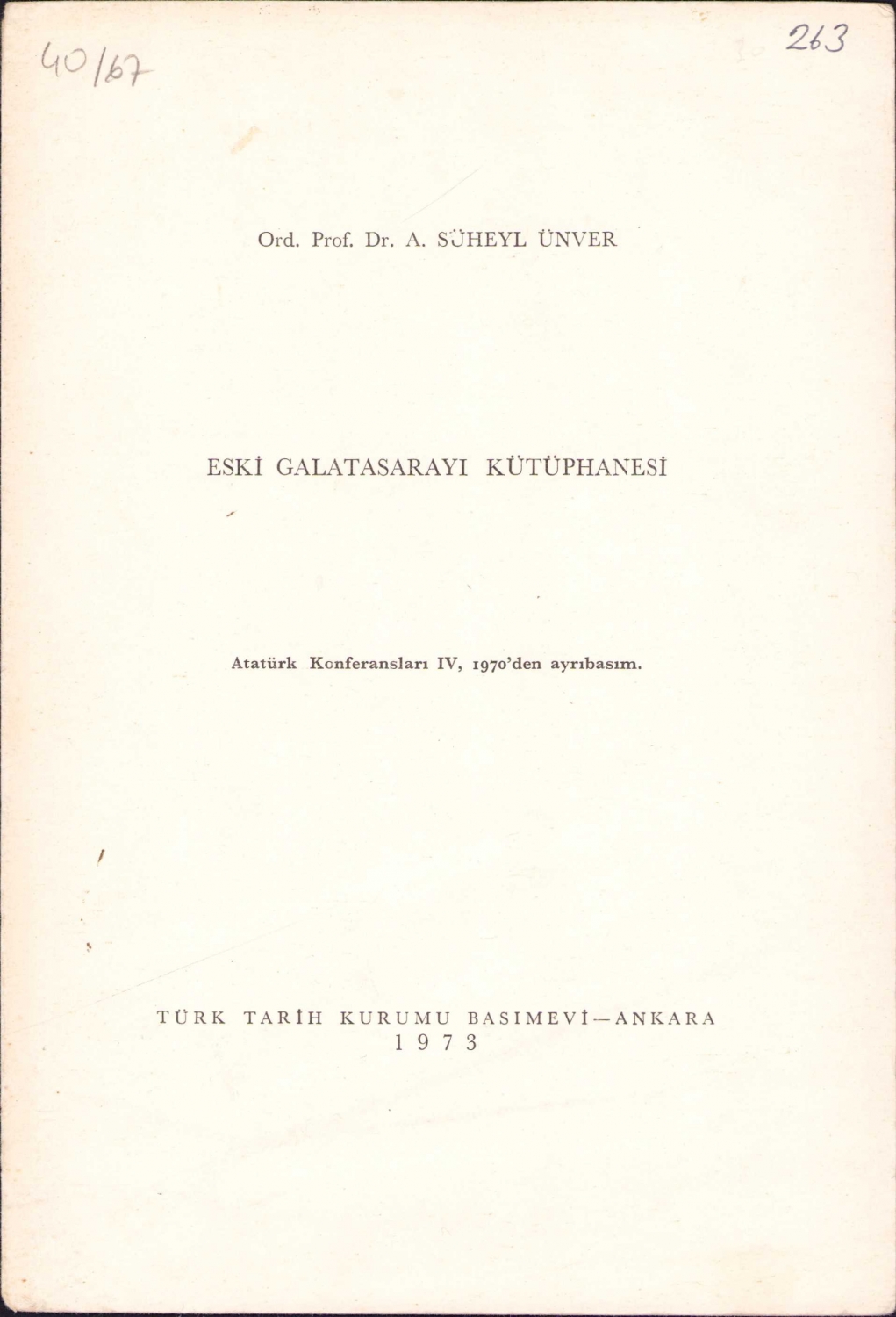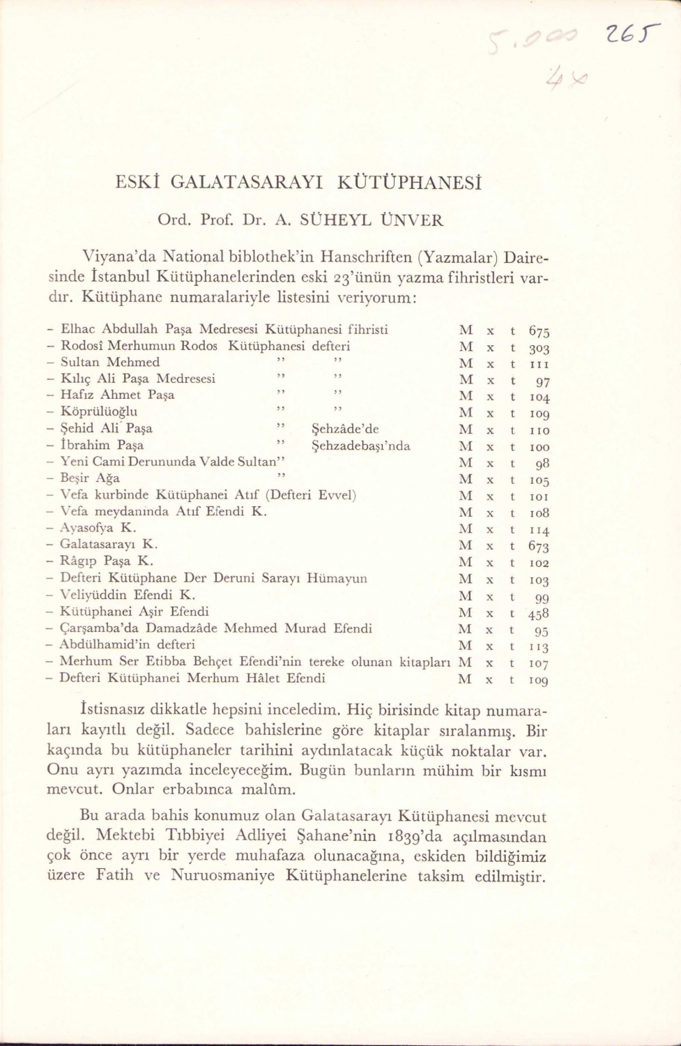 Eski Galatasarayı Kütüphanesi, Süheyl Ünver, Ankara, 1973, 3 sayfa, 16x24 cm