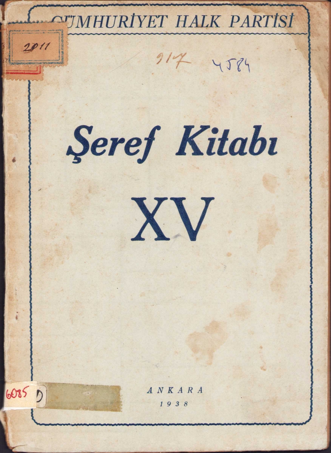 Cumhuriyet Halk Partisi Şeref Kitabı XV, Ankara, 1938, cilt sırtı tamirli, 70 sayfa, 14x19 cm