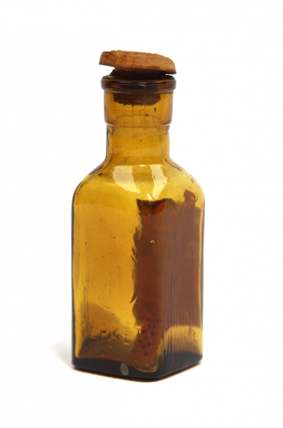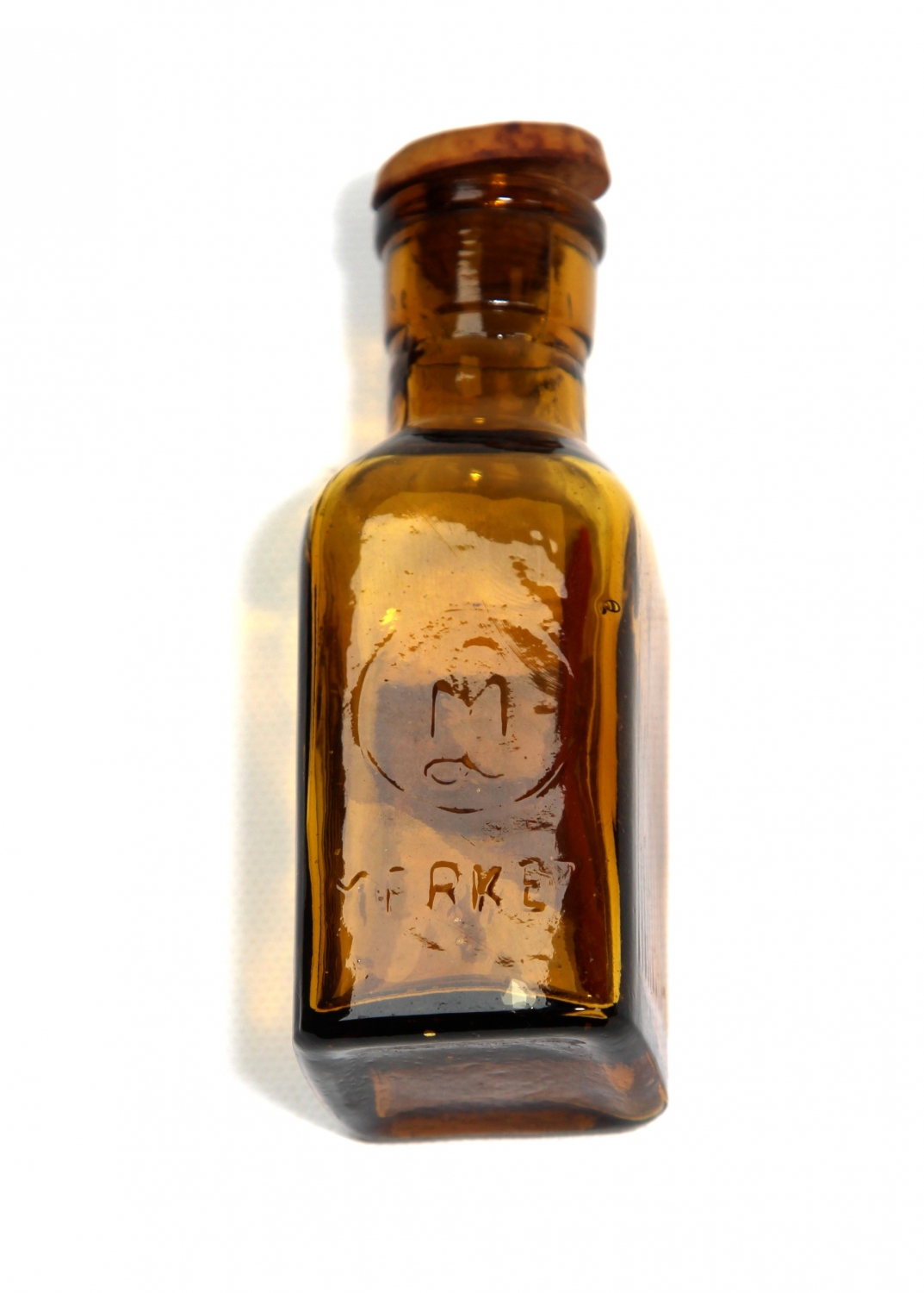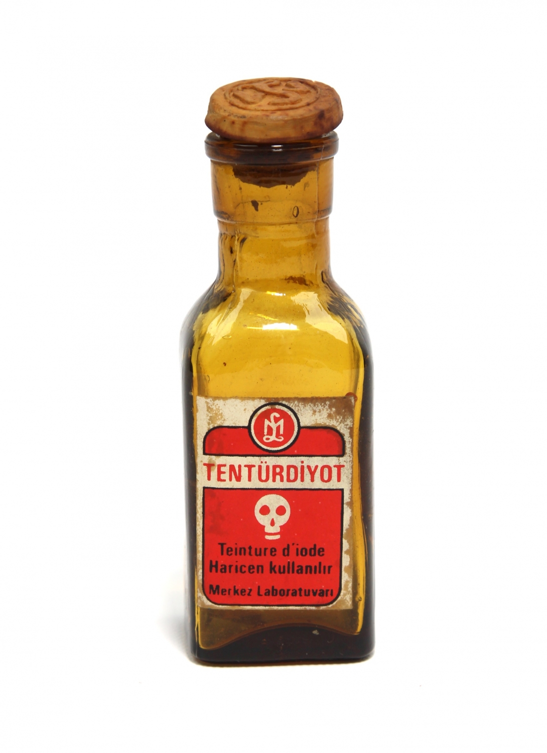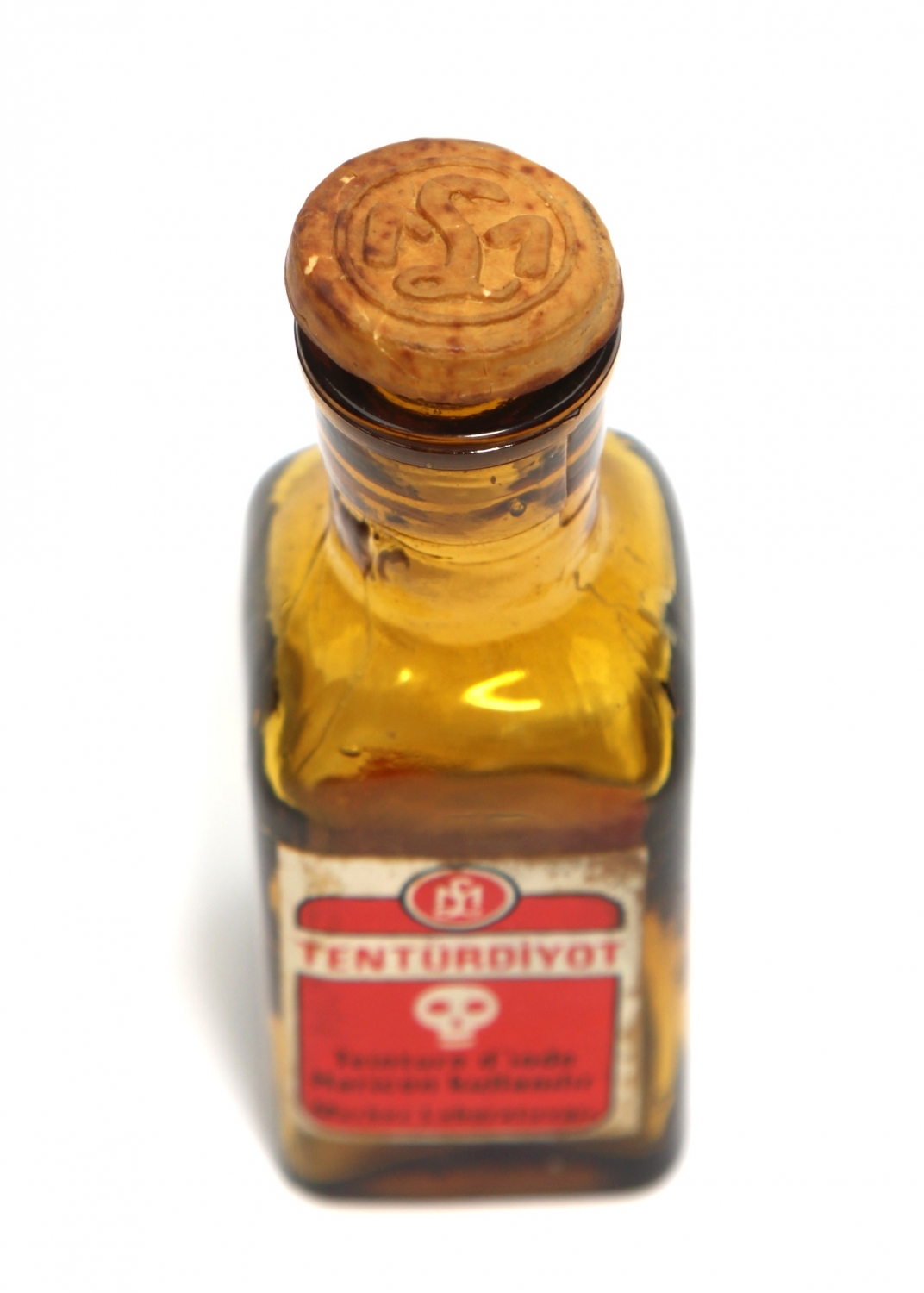 Tıp, Tentürdiyot şişesi, Merkez Laboratuarı, kabartma yazılı, inisiyalli tıpalı, 3x3x8 cm