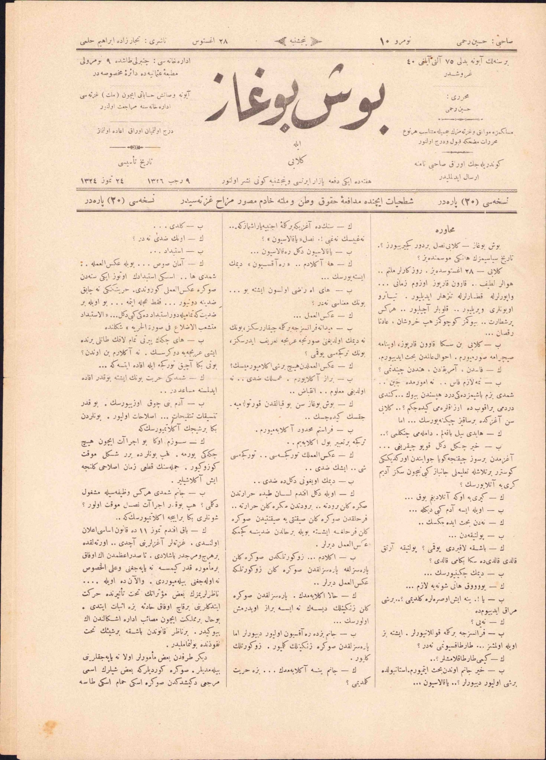 Osmanlıca Boşboğaz gazetesi, 1326, 4 sayfa, 28x40 cm