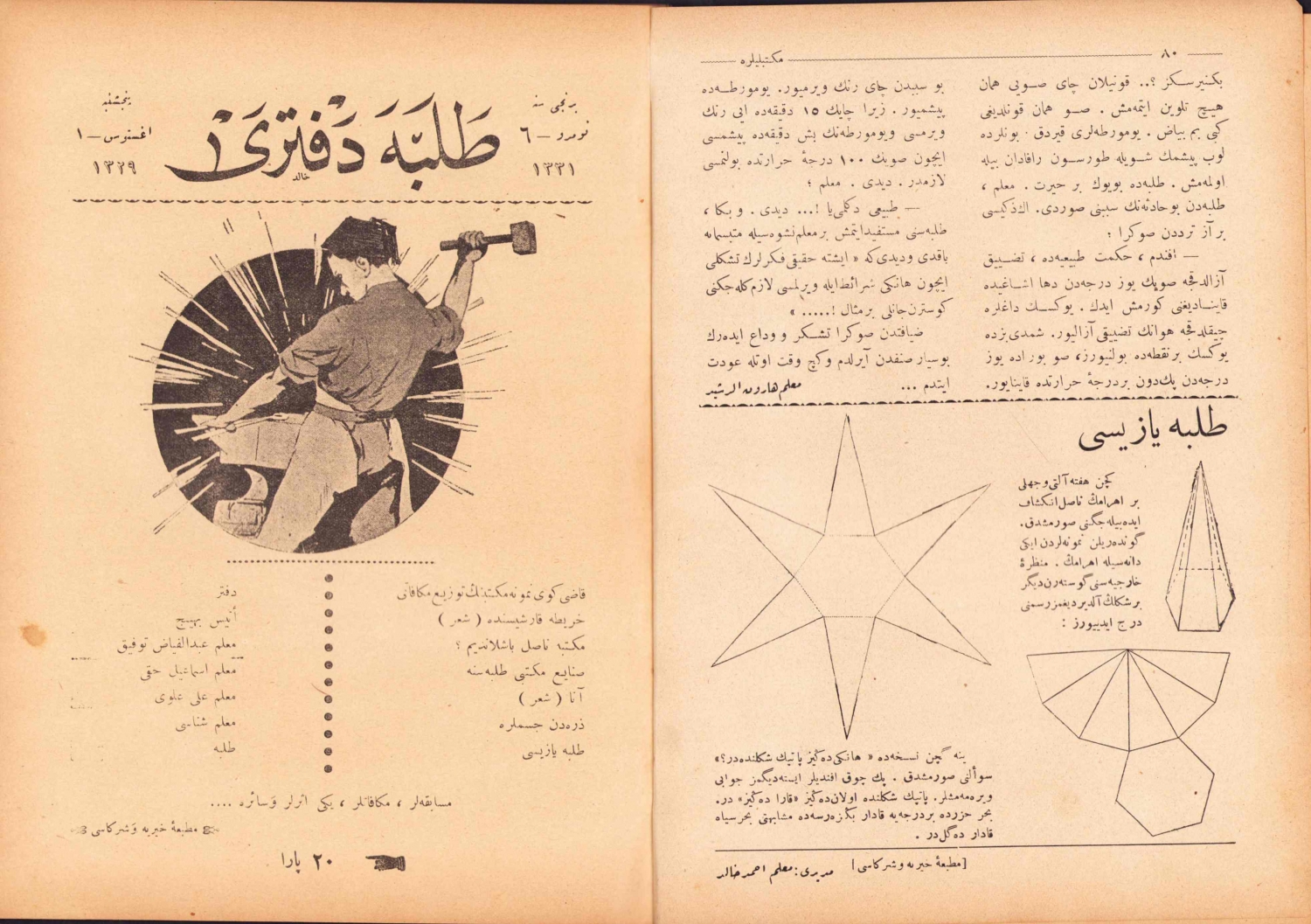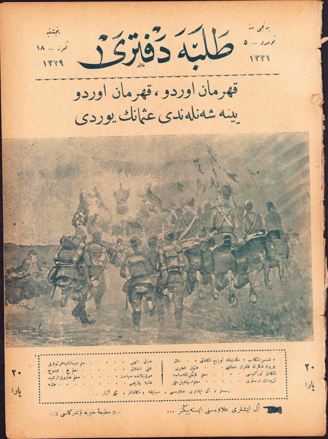 Osmanlıca Talebe Defteri, 1329, kapak "Kahraman Ordu, Kahraman Ordu Yine Şenlendi Osmanın Yurdu", cilt çıkması, resimli, 14 sayfa, 17x24 cm