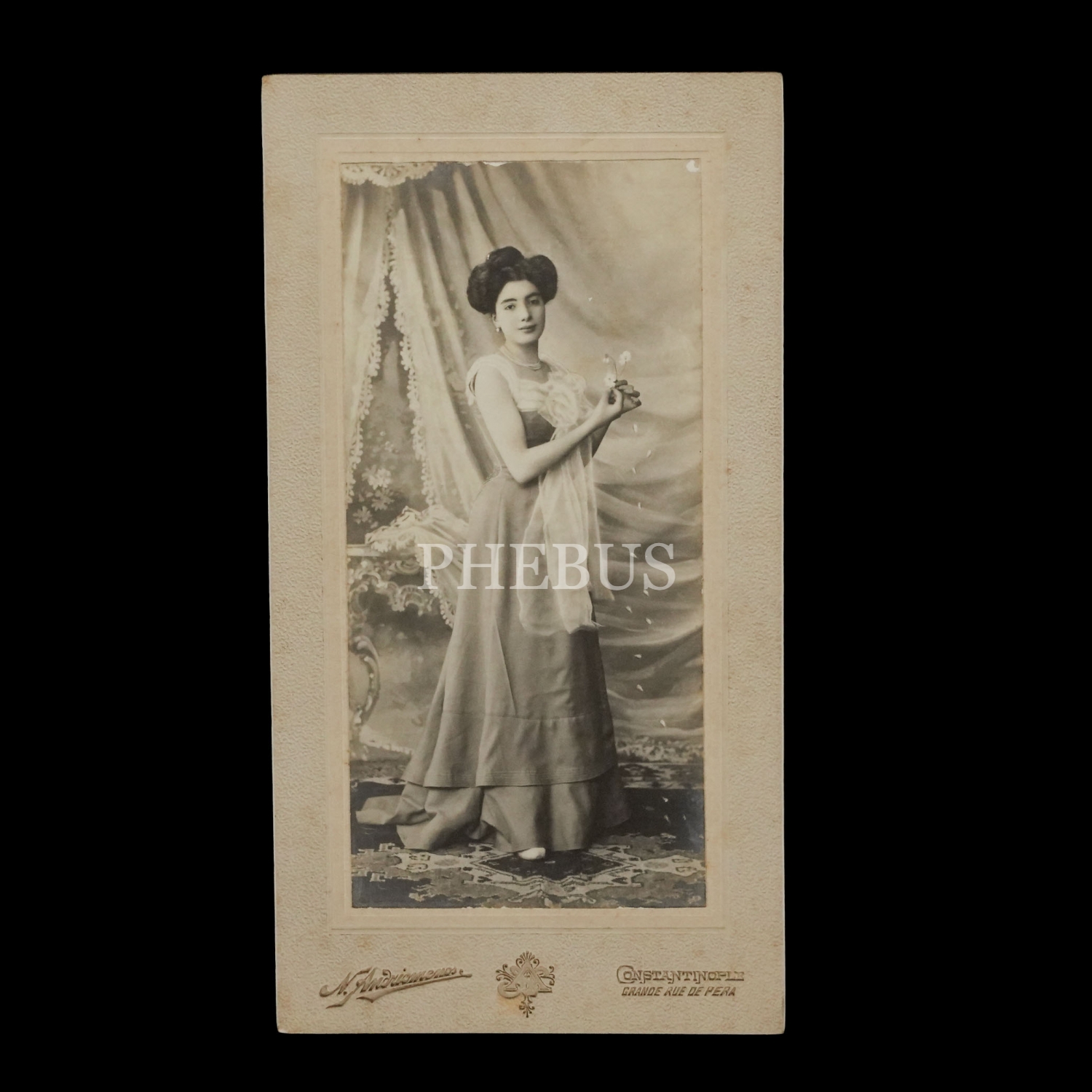 Elinde çiçeklerle poz veren zarif hanımefeninin N. (Nicolas) Andriomenos Fotoğrafhanesi´nde (Pera, Constantinople) aldırdığı stüdyo hatıra kabin fotoğrafı, 10x19 cm...