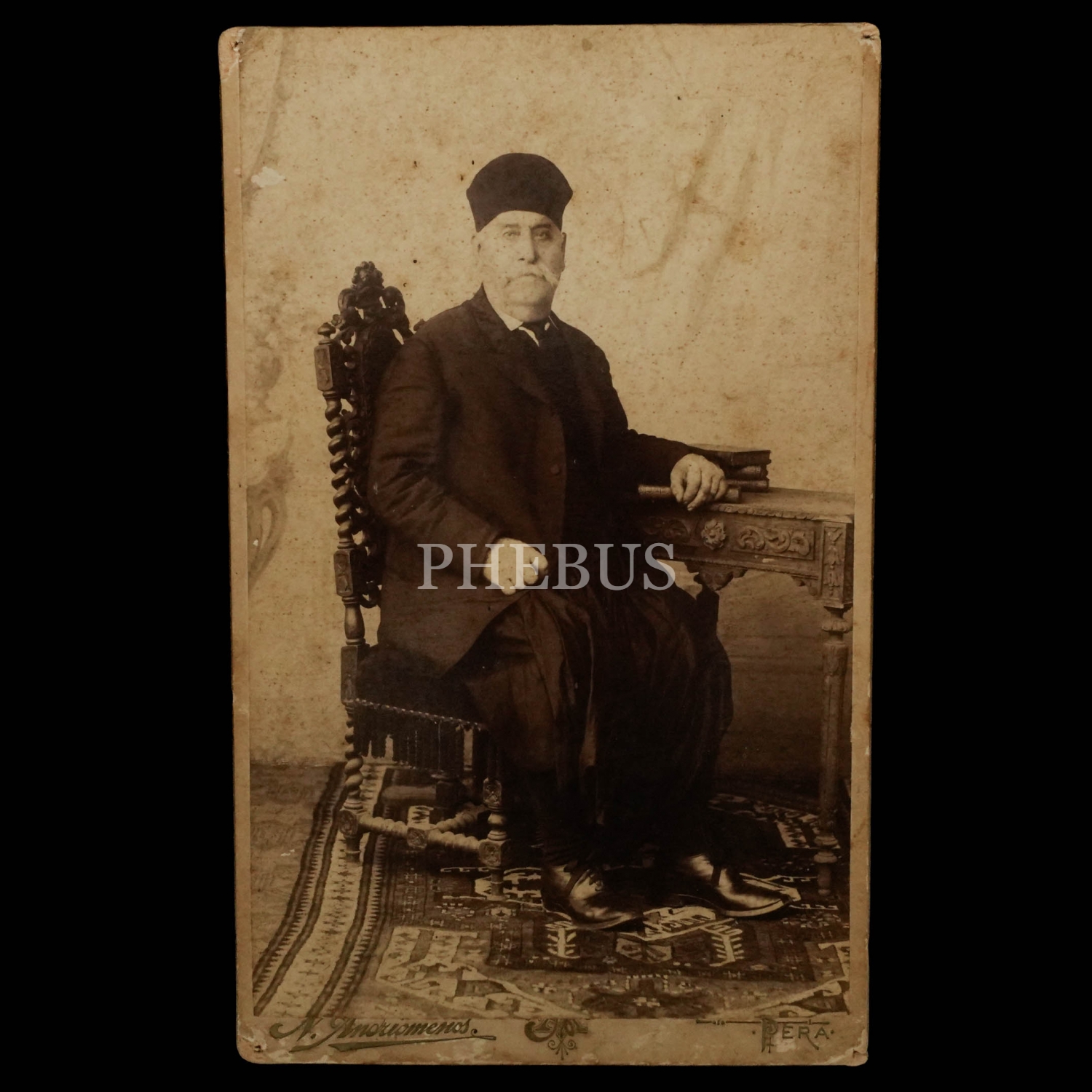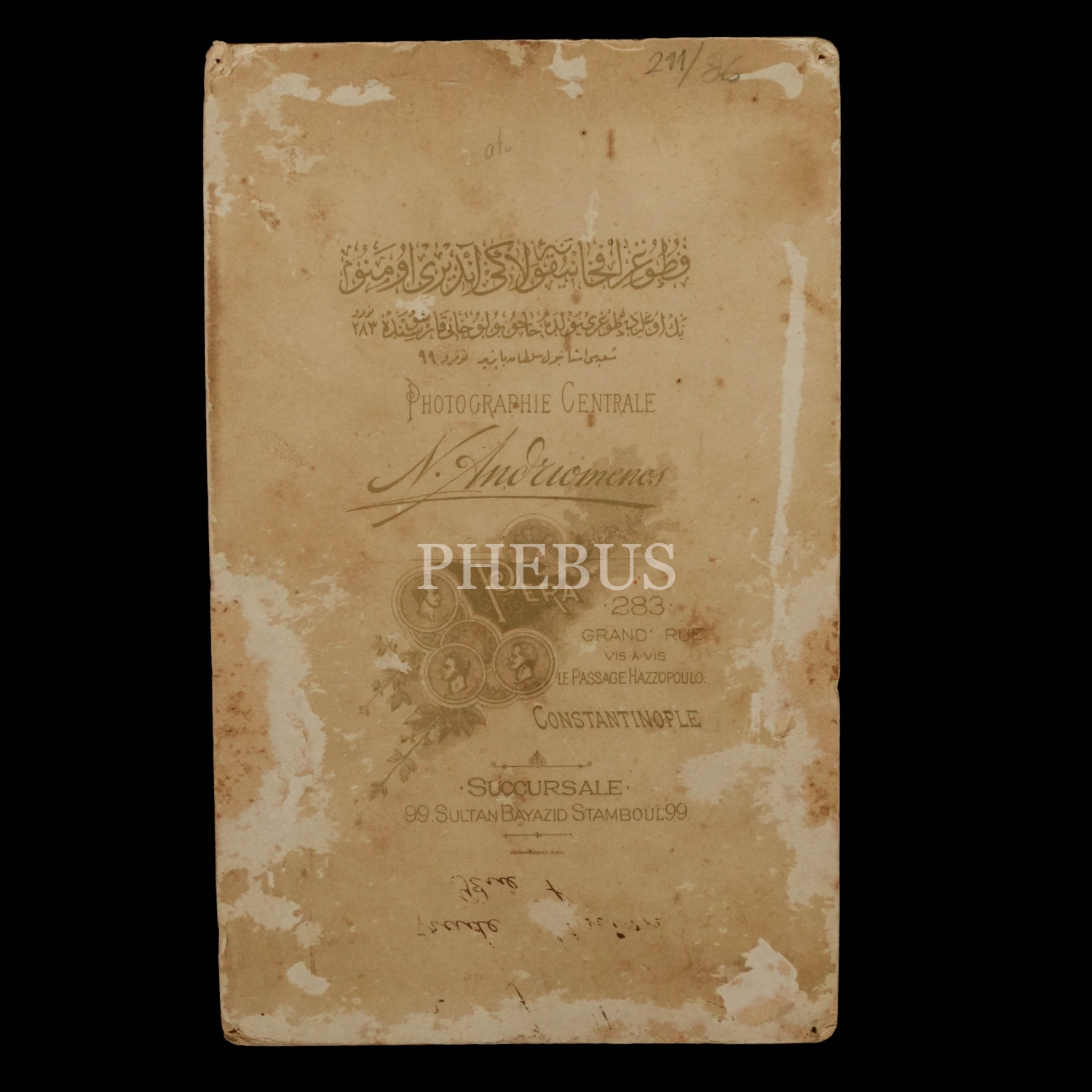 Gayrimüslim bir beyefendinin N. (Nicolas) Andriomenos Fotoğrafhanesi´nde (Pera, Constantinople) aldırdığı stüdyo hatıra kabin fotoğrafı, 13x22 cm...