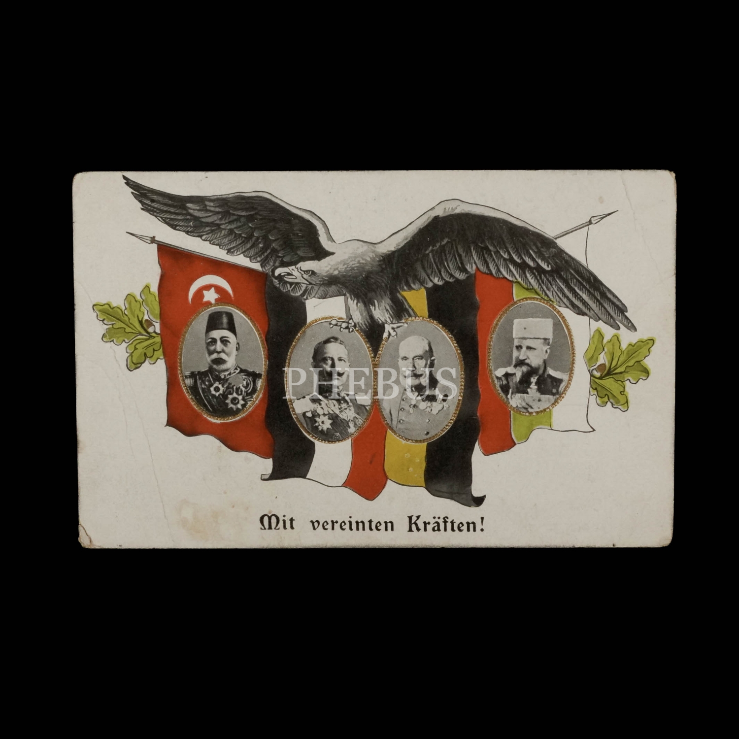 Sultan Mehmed Reşad, Kayzer Wilhelm, Franz Joseph ve I. Ferdinand görselli (gofre çerçevelerle), Almanca "Birleşik Güçlerle!" (Mit vereinten Kräften) yazılı İttifak kartpostalı, 14x9 cm...