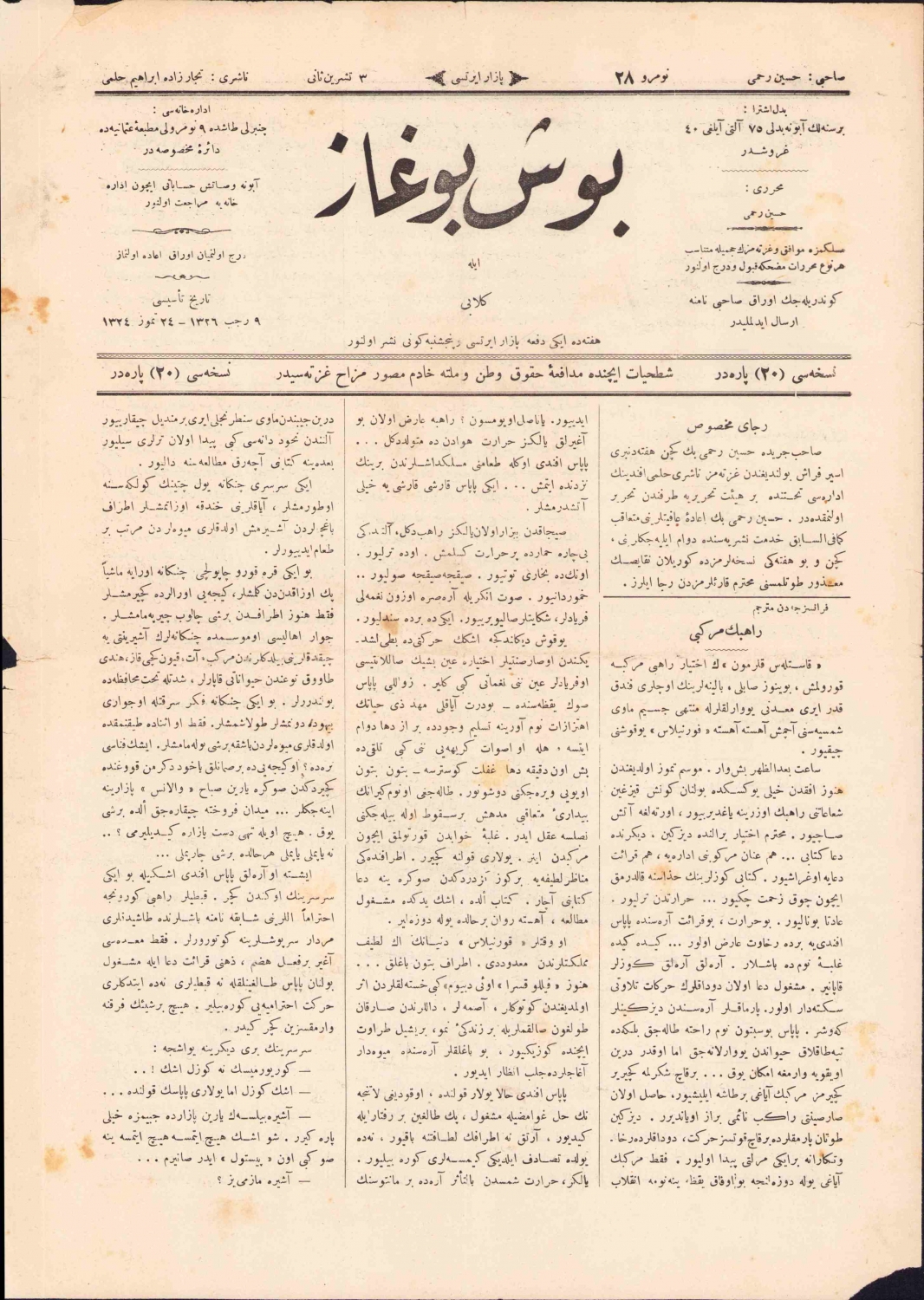 Osmanlıca Boşboğaz gazetesi, 1326, haliyle, 4 sayfa, 28x40 cm