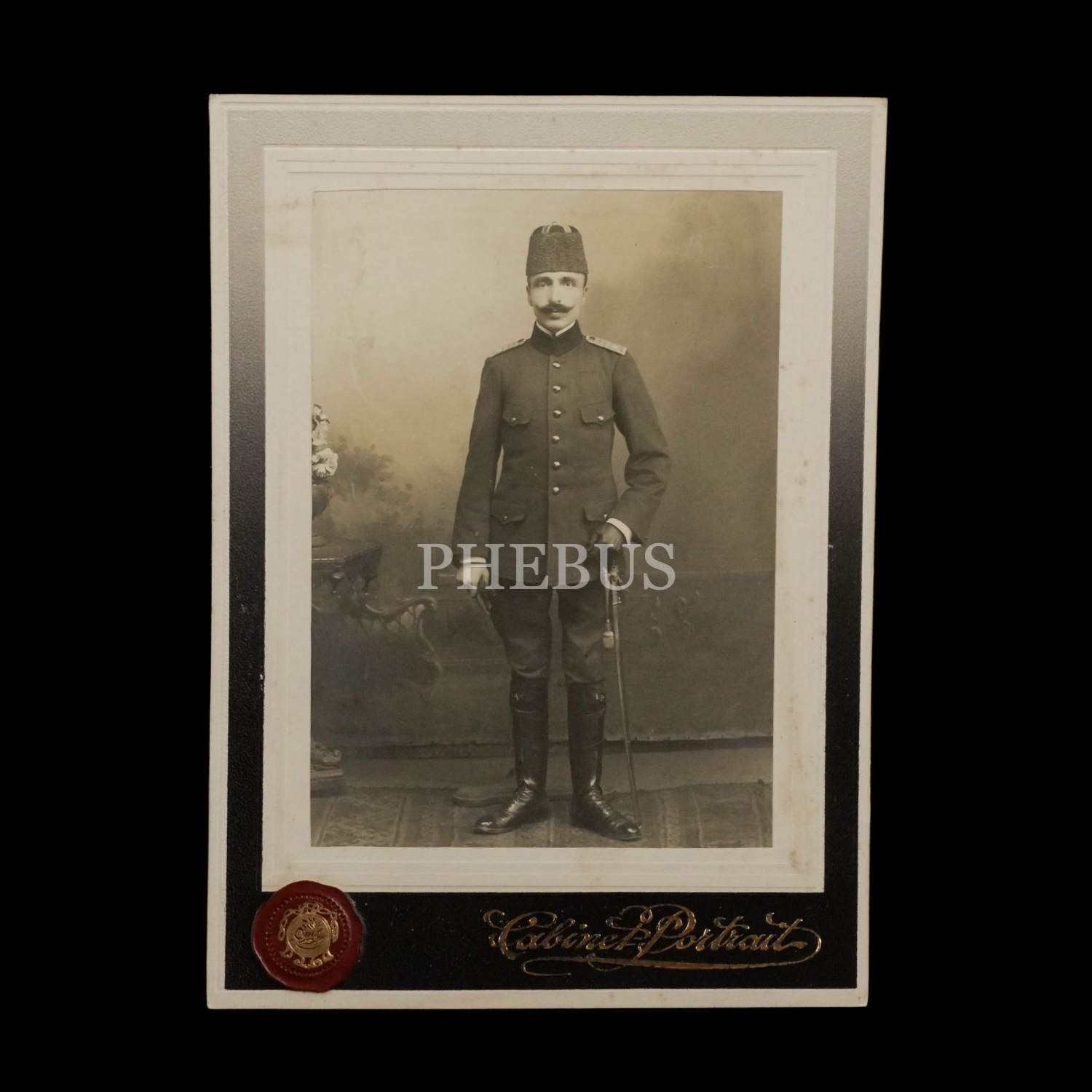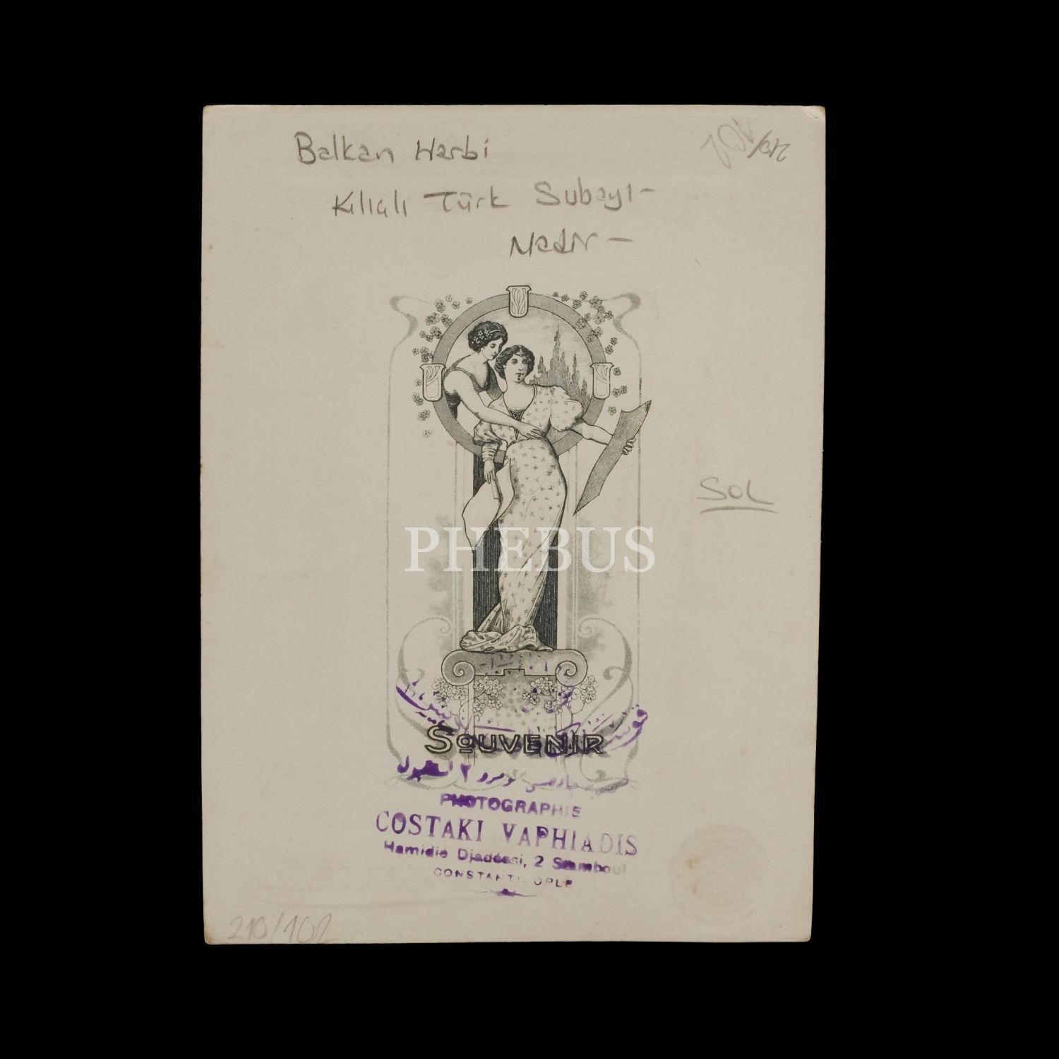 Balkan Harbi yıllarından kılıcıyla poz veren bir Osmanlı subayının Costaki Vaphiadis Fotoğrafhanesi´nde (Hamidie Djaddesi [Hamidiye Caddesi], Constantinople) aldırdığı stüdyo hatıra kabin fotoğrafı, 14x20 cm...