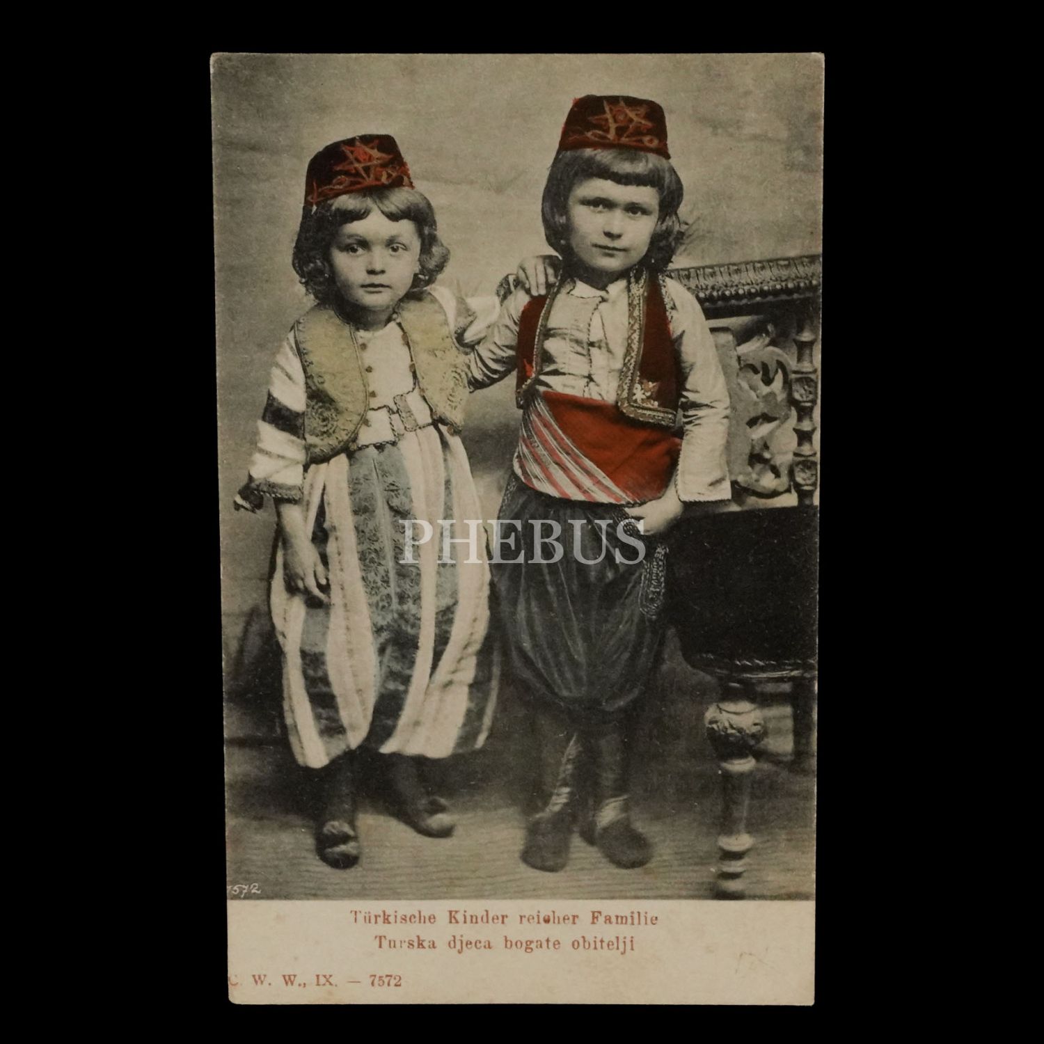 Zengin bir Türk ailenin çocukları temalı, Almanca ve Hırvatça yazılı kartpostal, "Türkische Kinder reicher Familie / Turska djeca bogate obitelji", 9x14 cm...