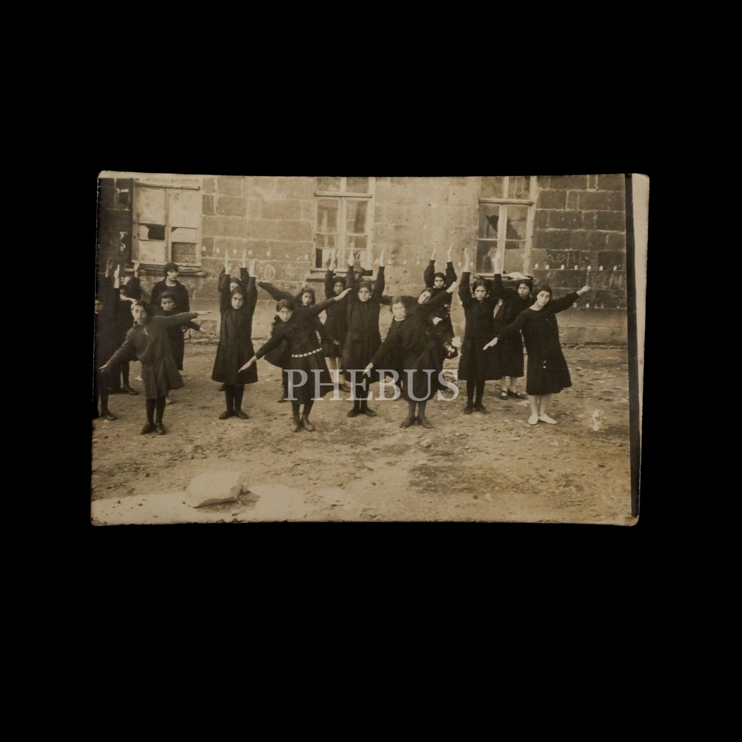 Erken Cumhuriyet döneminden bir kız lisesi öğrencilerinin jimnastik dersinde alınmış enstantane fotoğrafı, 14x9 cm...