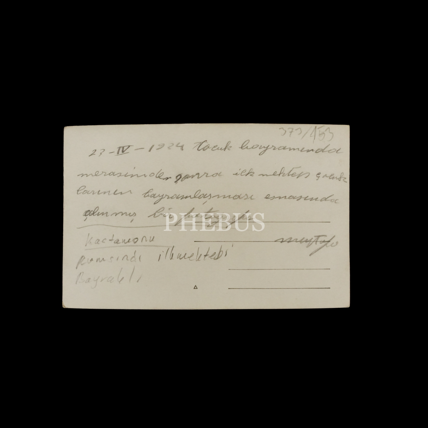Fotoğrafın arka yüzüne şu not düşülmüştür: "23-IV-1934 Çocuk bayramında merasimden sonra ilk mektep çocuklarının bayramlaşması esnasında alınmış bir fotoğraf."
