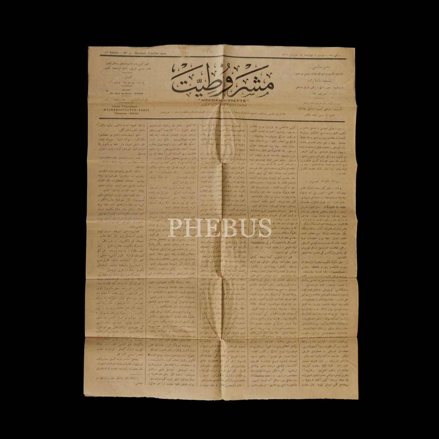 İttihatçıların jurnalci ithamıyla suçladığı Mehmed Şerif Paşa´nın, Paris´te İttihat ve Terakki Partisi aleyhine çıkardığı MEŞRUTİYET gazetesinin 6 Haziran 1910 tarihli nüshası, 38x51 cm...